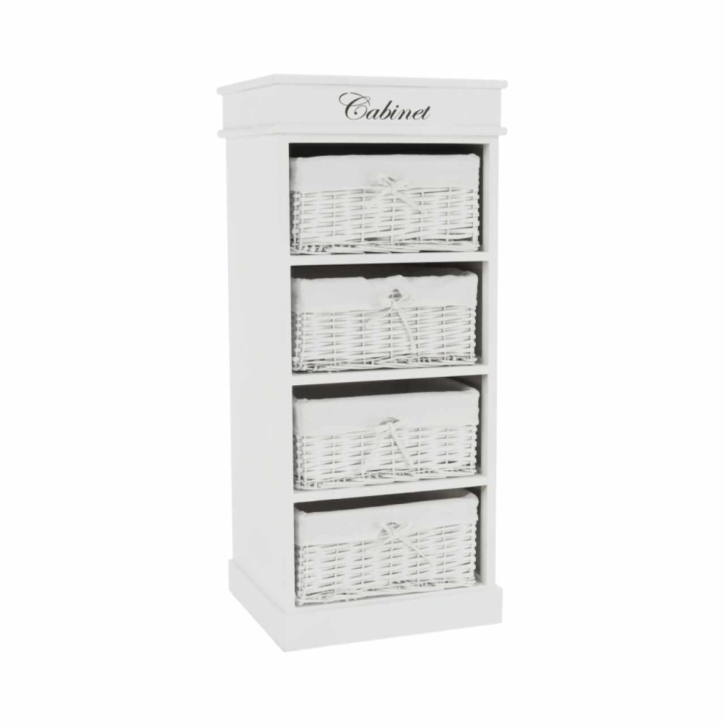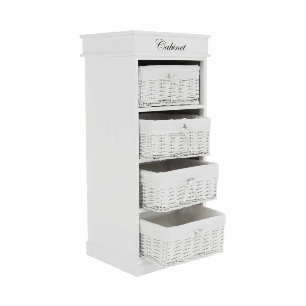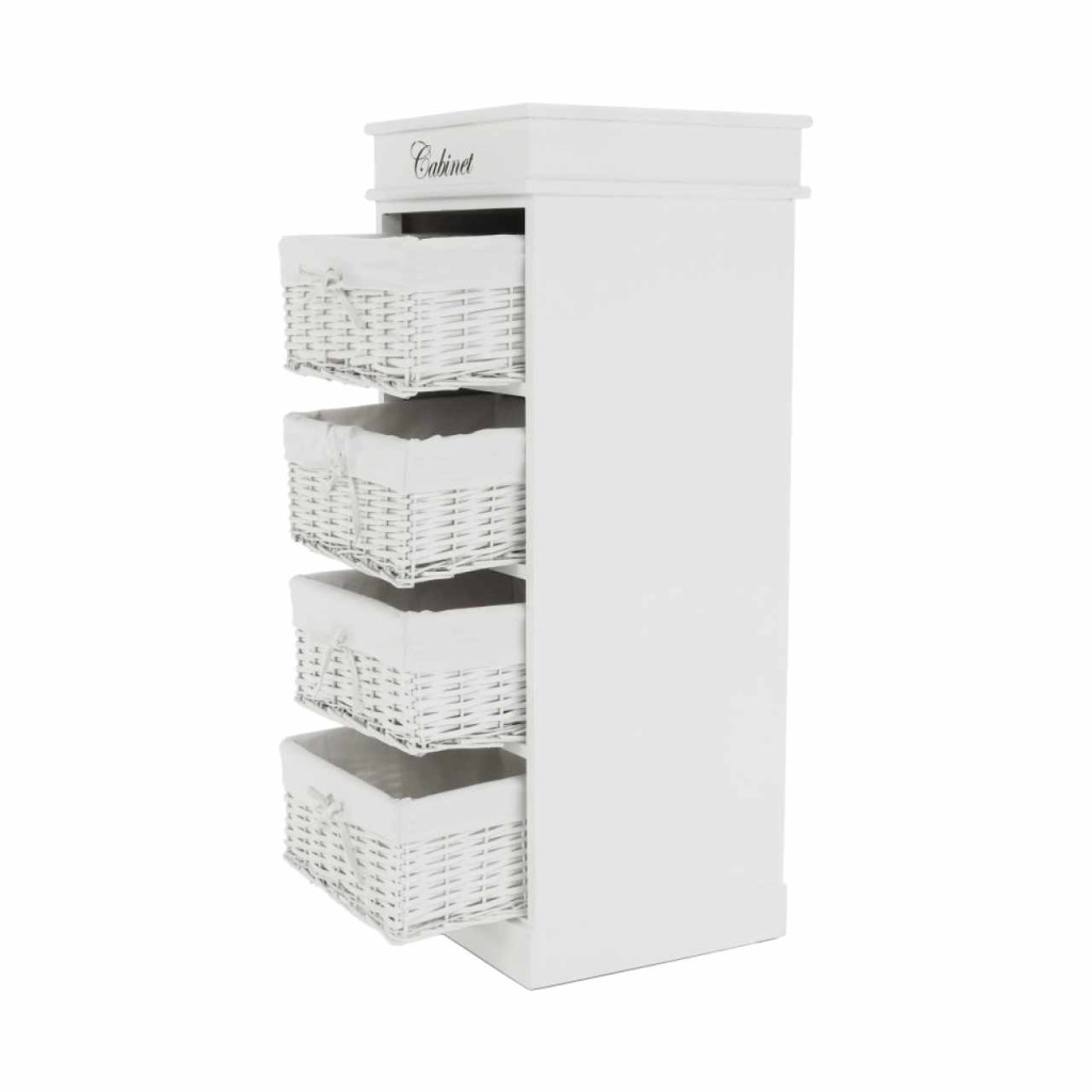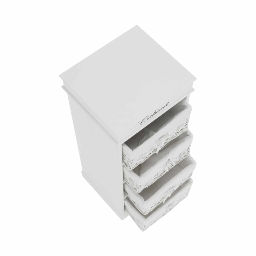 4- fiókos komód BLANCOAnyag: fa/vesszőfonás/szövetSzínváltozat: fehérMéretek: (SzéxMéxMa): 45x40x104 cmSzállítás szétszerelve.