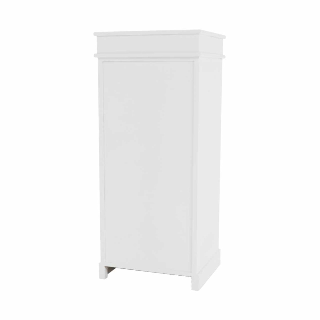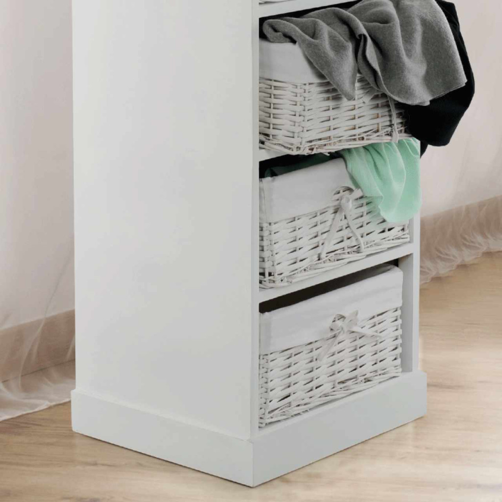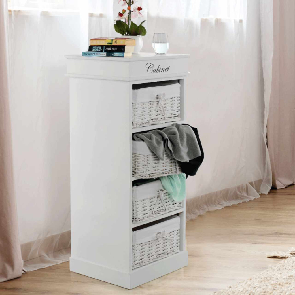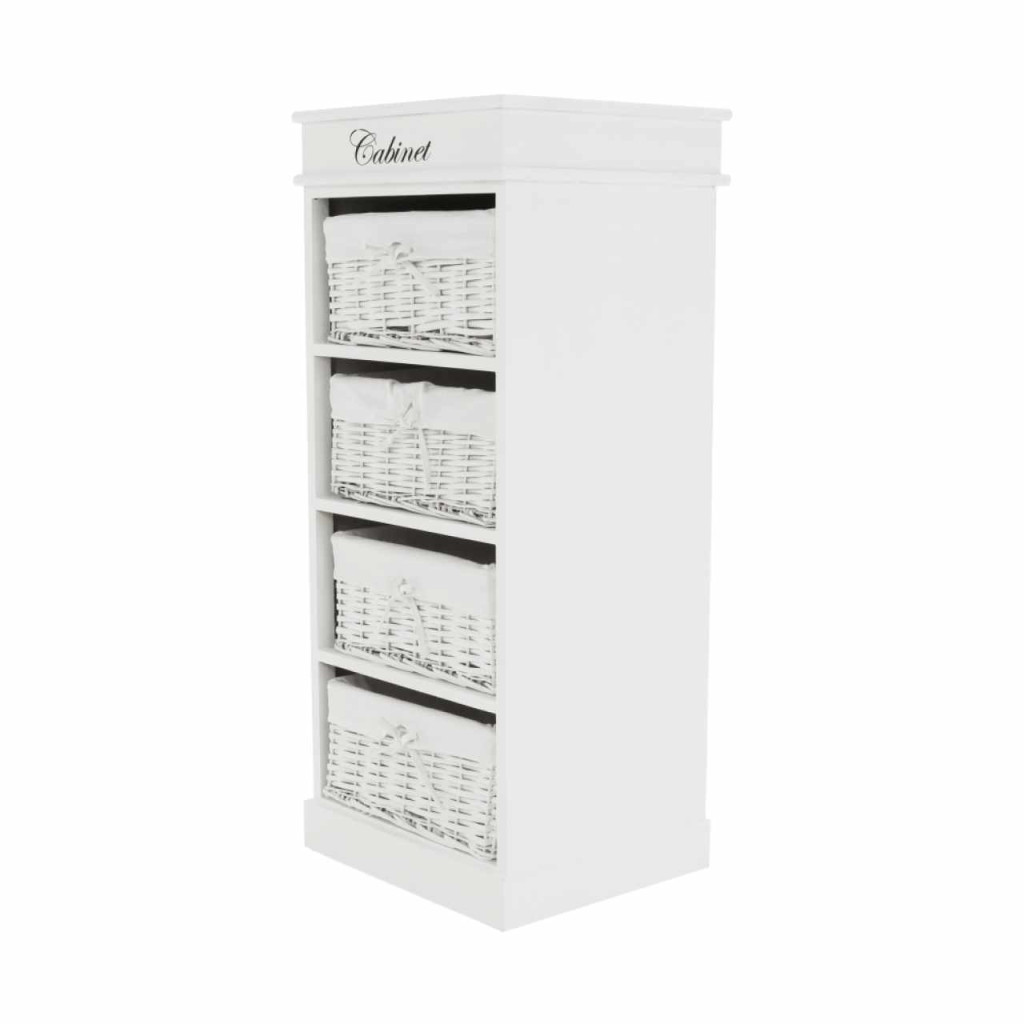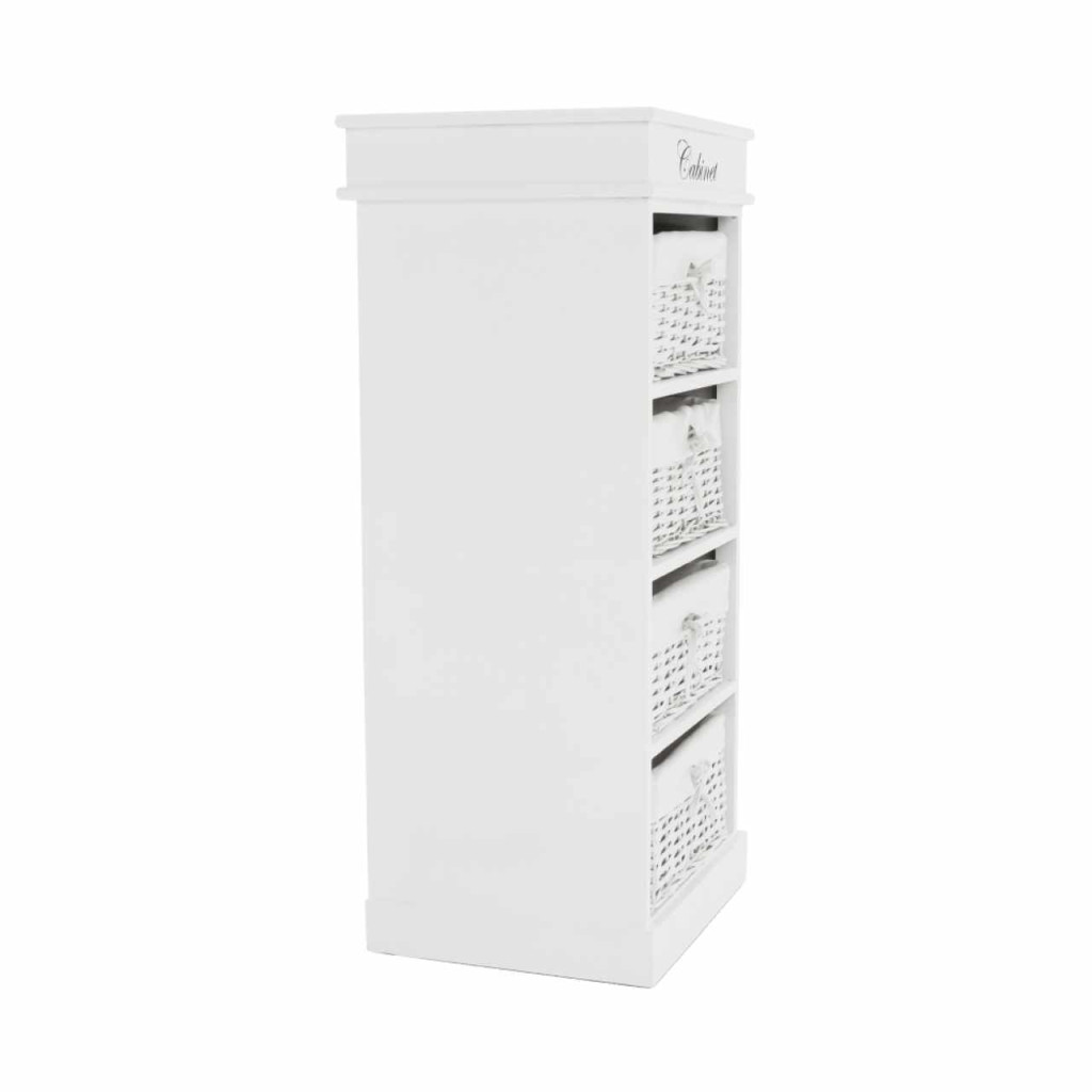 4- fiókos komód BLANCOAnyag: fa/vesszőfonás/szövetSzínváltozat: fehérMéretek: (SzéxMéxMa): 45x40x104 cmSzállítás szétszerelve.