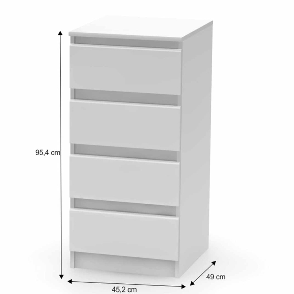 4 fiókos komód HANY NEW 009 Anyag: laminált DTD Színe: fehér Méretek (SzéxMéxMa): 45,2x49x95,4 cm Minőségi szlovák termék. ABS élek Szállítás szétszerelve.