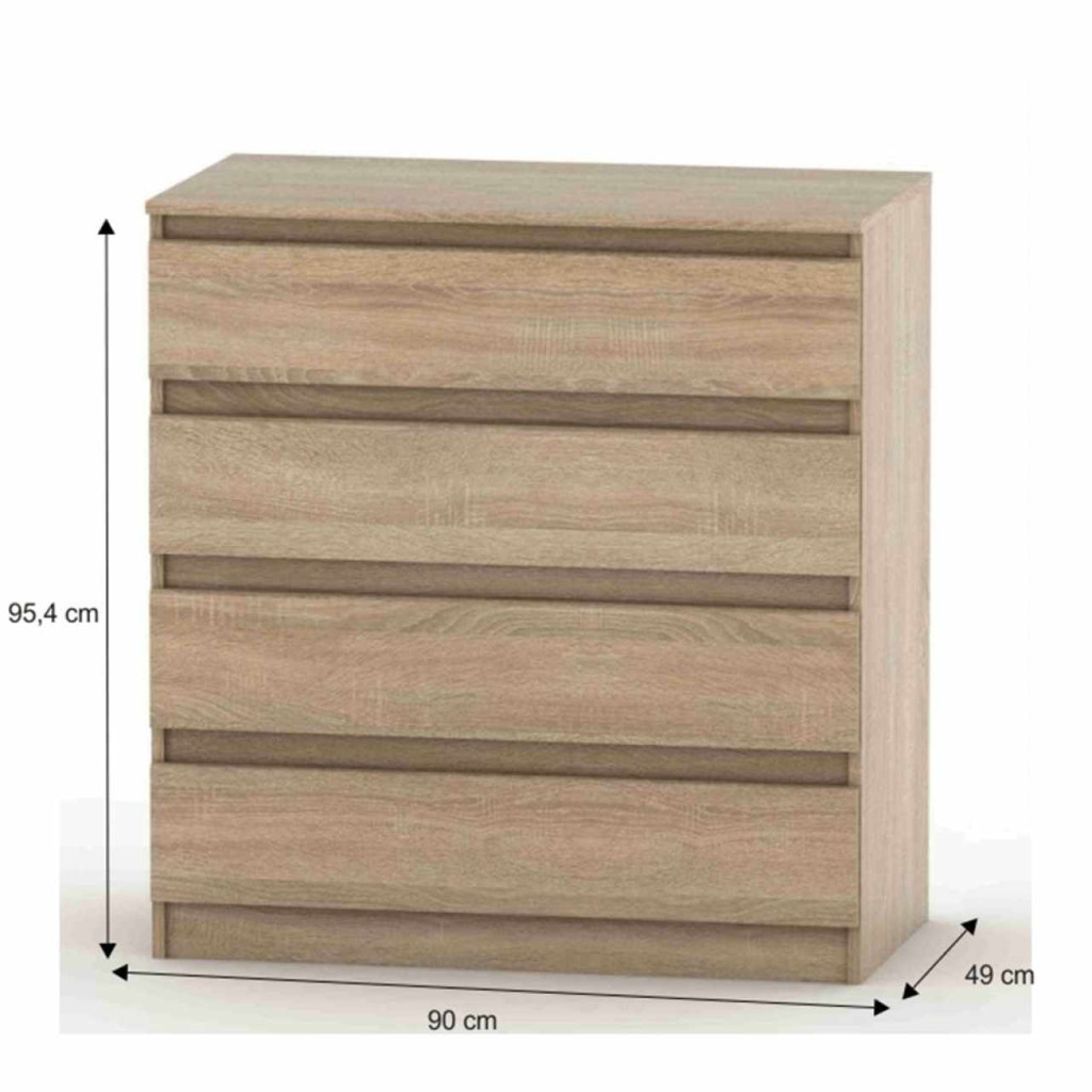 4 fiókos komód HANY NEW 004 Anyag: laminált DTD Színe: sonoma tölgy Méretek (SzéxMéxMa): 90x49x95,4 cm Minőségi szlovák termék. ABS élek Szállítás szétszerelve.