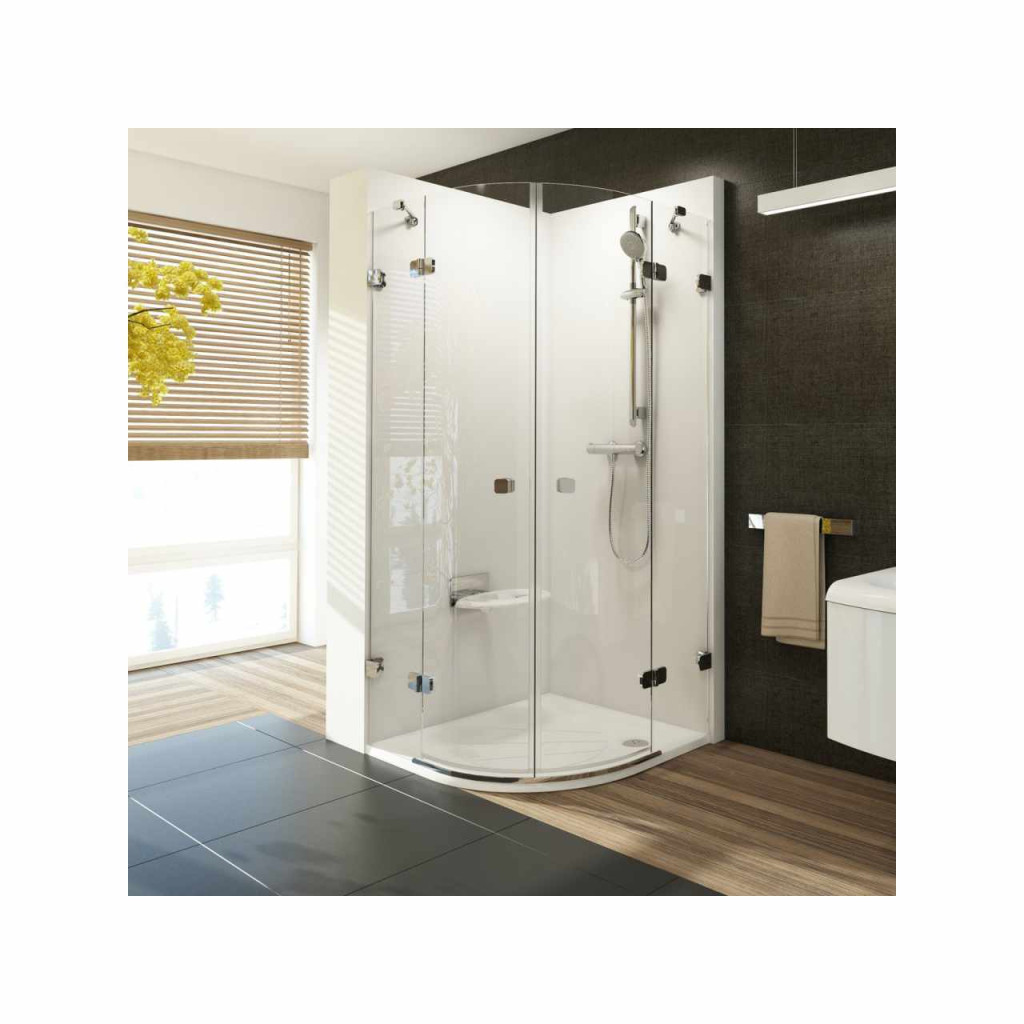 A pántok a zuhanyzó belsejében az üvegbe vannak süllyesztve, és így megkönnyítik annak karbantartását. A felemelő mechanizmus automatikusan becsukja az ajtót és felemeli a küszöb fölé nyitáskor és záráskor. A tiszta fém és a masszív kivitelű ergonomikus fogantyúk kiemelik a teljes zuhanyzó impozáns hatását. Két rövid üvegtartó biztosítja a termék maximális stabilitását.