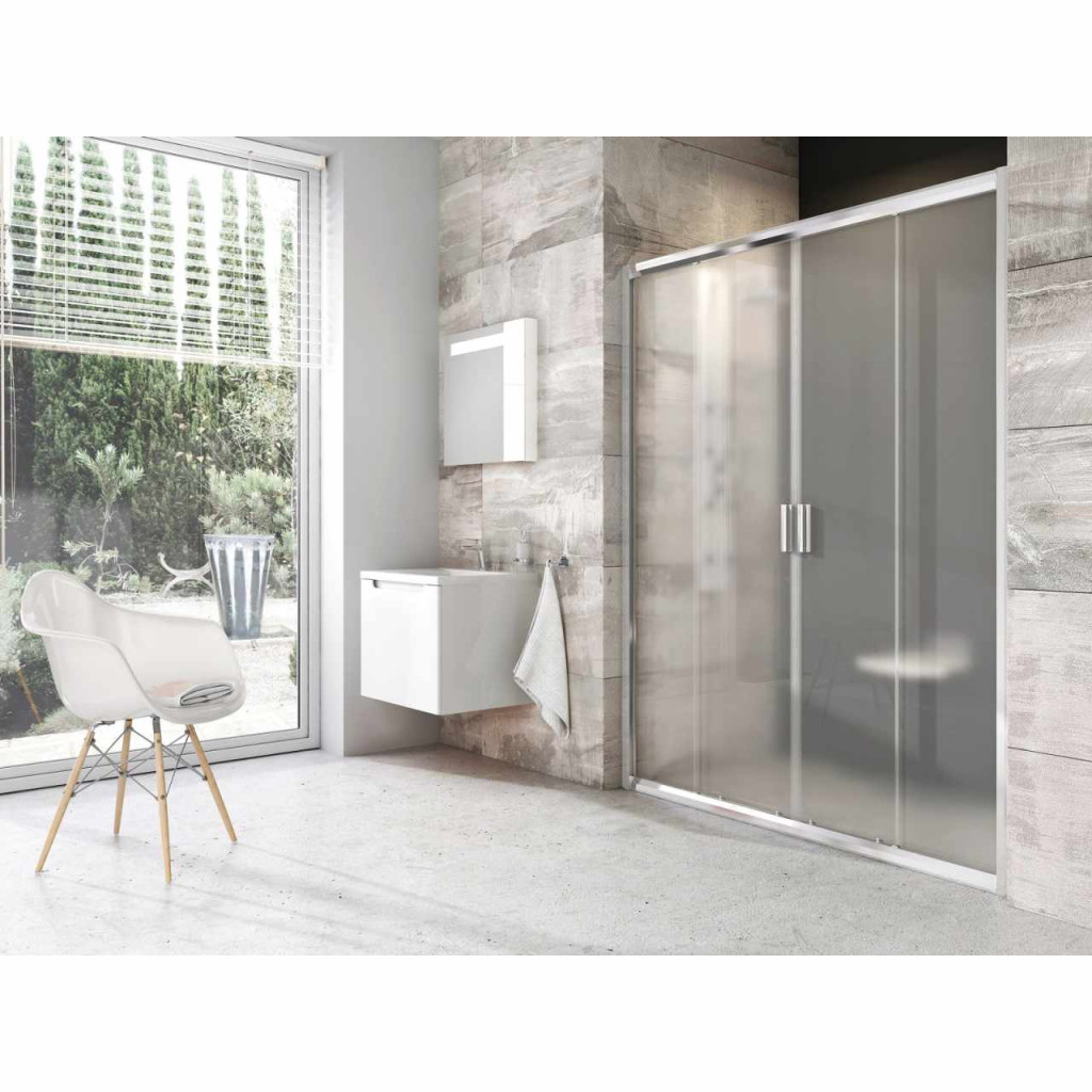Négyrészes Blix zuhanyajtó krómhatású kivitelben, Grape biztonsági üveggel és Ravak AntiCalc® vízlepergető réteggel. Tolóajtós rendszer.