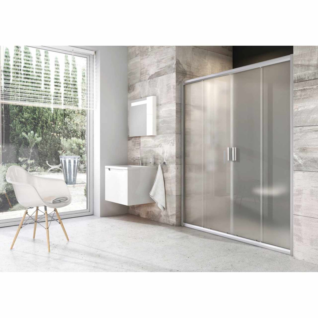 Négyrészes Blix zuhanyajtó szatén kivitelben, Grape biztonsági üveggel és Ravak AntiCalc® vízlepergető réteggel. Tolóajtós rendszer.
