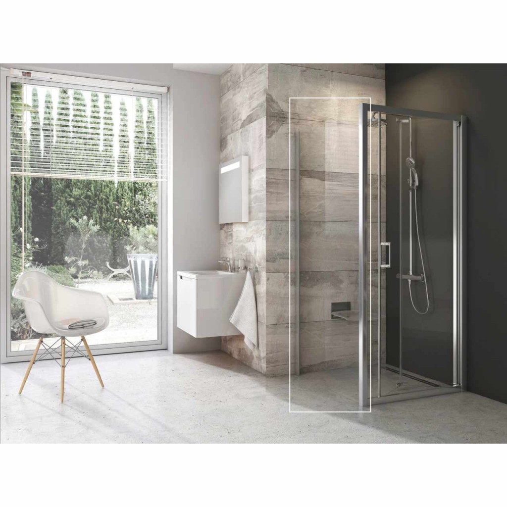 Blix egyrészes fix fal, krómhatású kivitelben, átlátszó biztonsági üveggel és Ravak AntiCalc® vízlepergető réteggel.