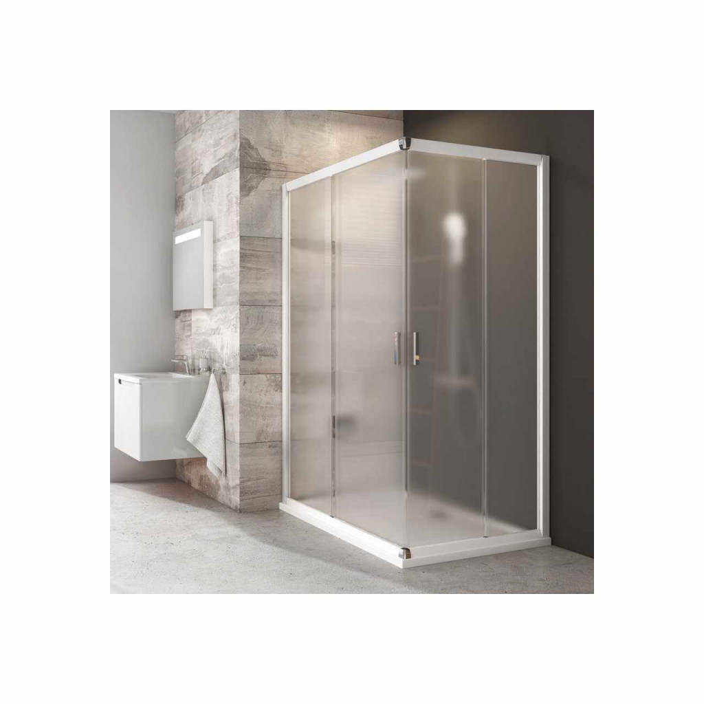 Egy oldal Blix sarokzuhanykabin kialakításához, fehér kerettel, Grape biztonsági üveggel és Ravak AntiCalc® vízlepergető réteggel. Tolóajtós rendszer. A termék egy fix és egy mozgó részből áll. A teljes zuhanykabin két oldalból áll!