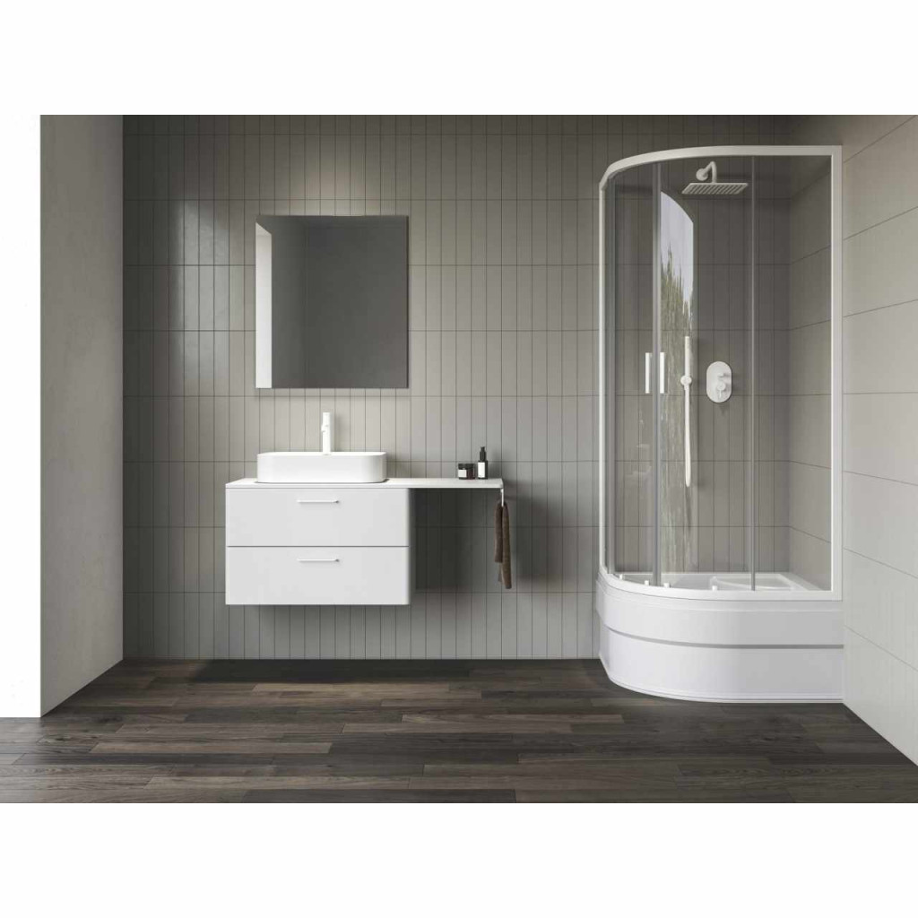 Négyrészes, negyedköríves Blix II zuhanykabin matt fehér színben, átlátszó, edzett, biztonsági üveggel és Ravak AntiCalc® vízlepergető réteggel. Tolóajtós rendszer.