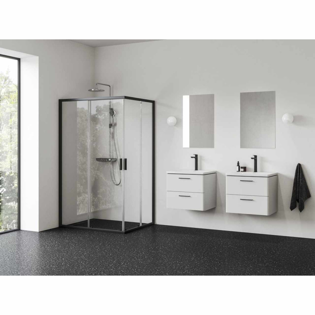 Egy oldal Blix II sarokzuhanykabin kialakításához, fekete kerettel, átlátszó biztonsági üveggel és Ravak AntiCalc® vízlepergető réteggel. Tolóajtós rendszer. A termék egy fix és egy mozgó részből áll. A teljes zuhanykabin két oldalból áll!