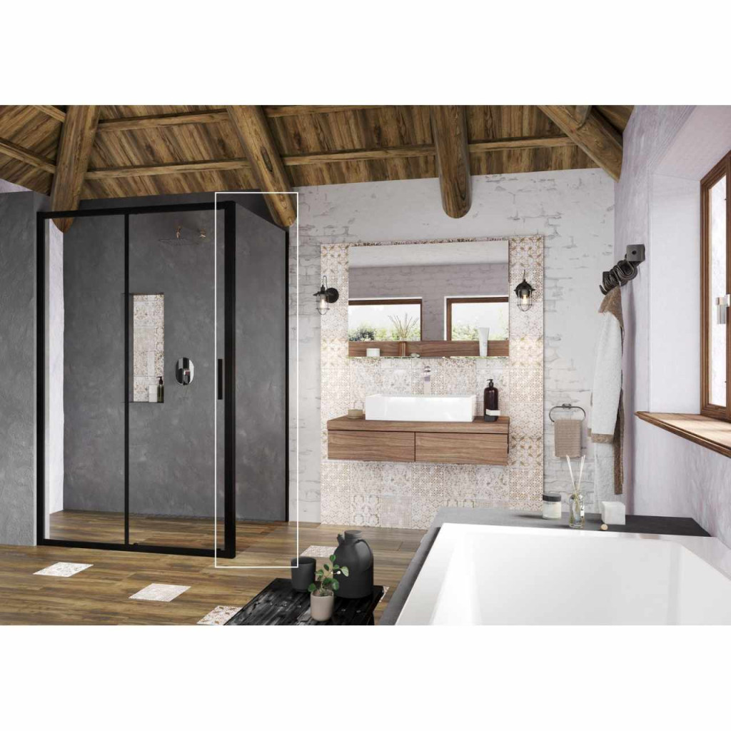 Blix Slim fix fal, fekete kivitelben, átlátszó biztonsági üveggel és Ravak AntiCalc® vízlepergető réteggel. Forgatható termék bal és jobb oldali változat kialakításához.