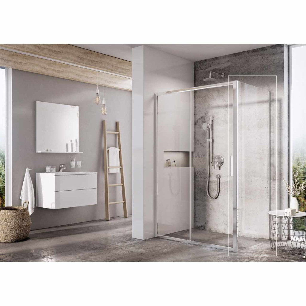Blix Slim fix fal, fényes krómhatású kivitelben, átlátszó biztonsági üveggel és Ravak AntiCalc® vízlepergető réteggel. Forgatható termék bal és jobb oldali változat kialakításához.