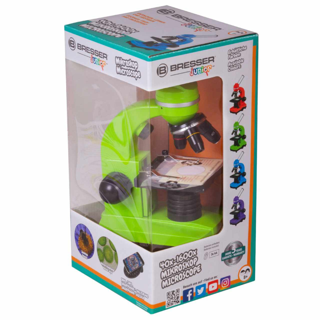 Színes mikroszkóp gyerekeknek. Kísérletező készletet tartalmaz. Nagyítás: 40–1600x , Bresser Junior Biolux SEL 40–1600x microscope with its extensive range of accessories offers an optimal introduction to microscopy. Unique to these models is the Barlow zoom system in the eyepiece socket: by means of a pull-out additional lens, the magnification can be continuously changed up to 2 times during visual observation, so that together with 3 objectives and 2 interchangeable wide-field eyepieces magnifications of 40x to 1600x can be achieved. Bresser Junior Biolux SEL 40–1600x microscope with its extensive range of accessories offers an optimal introduction to microscopy. Unique to these models is the Barlow zoom system in the eyepiece socket: by means of a pull-out additional lens, the magnification can be continuously changed up to 2 times during visual observation, so that together with 3 objectives and 2 interchangeable wide-field eyepieces magnifications of 40x to 1600x can be achieved.
