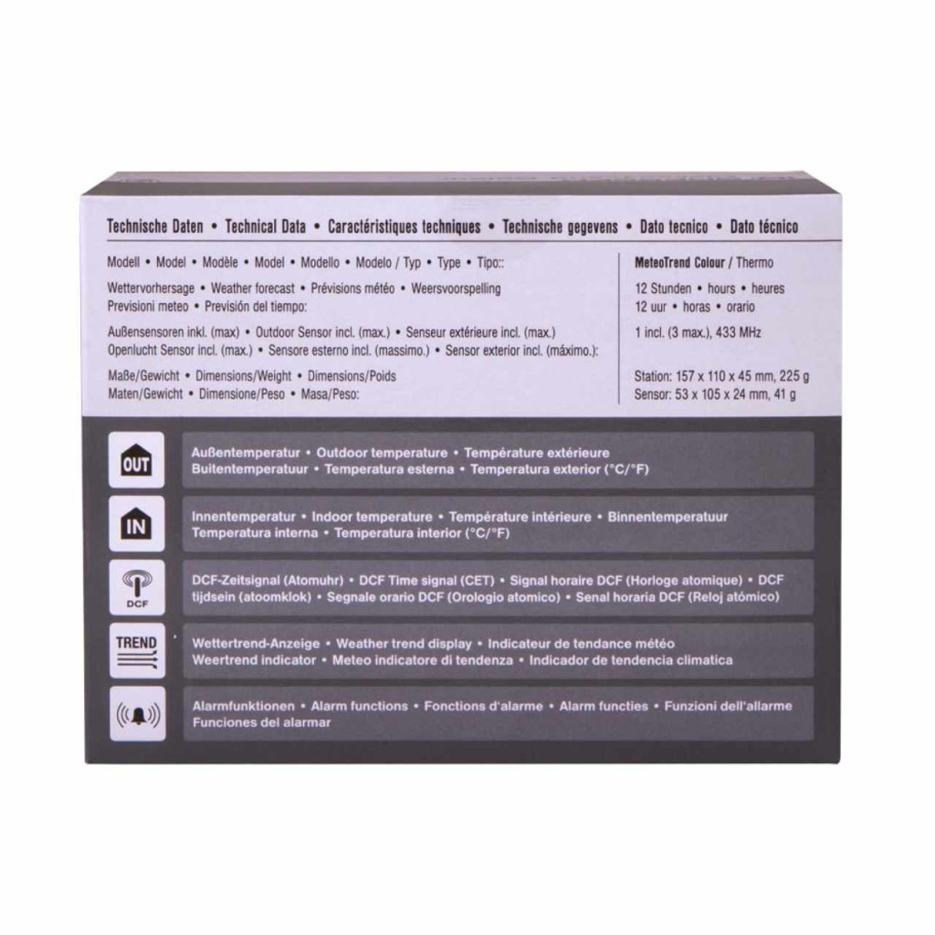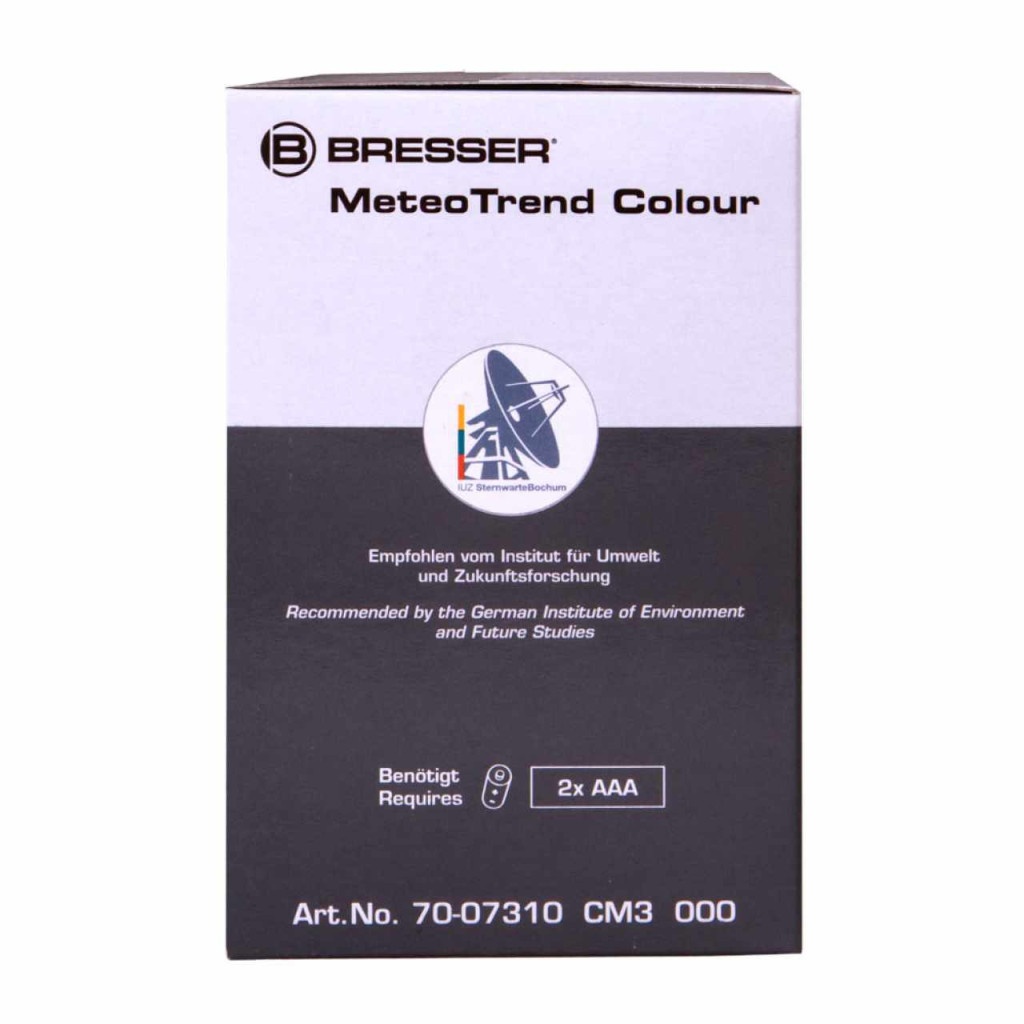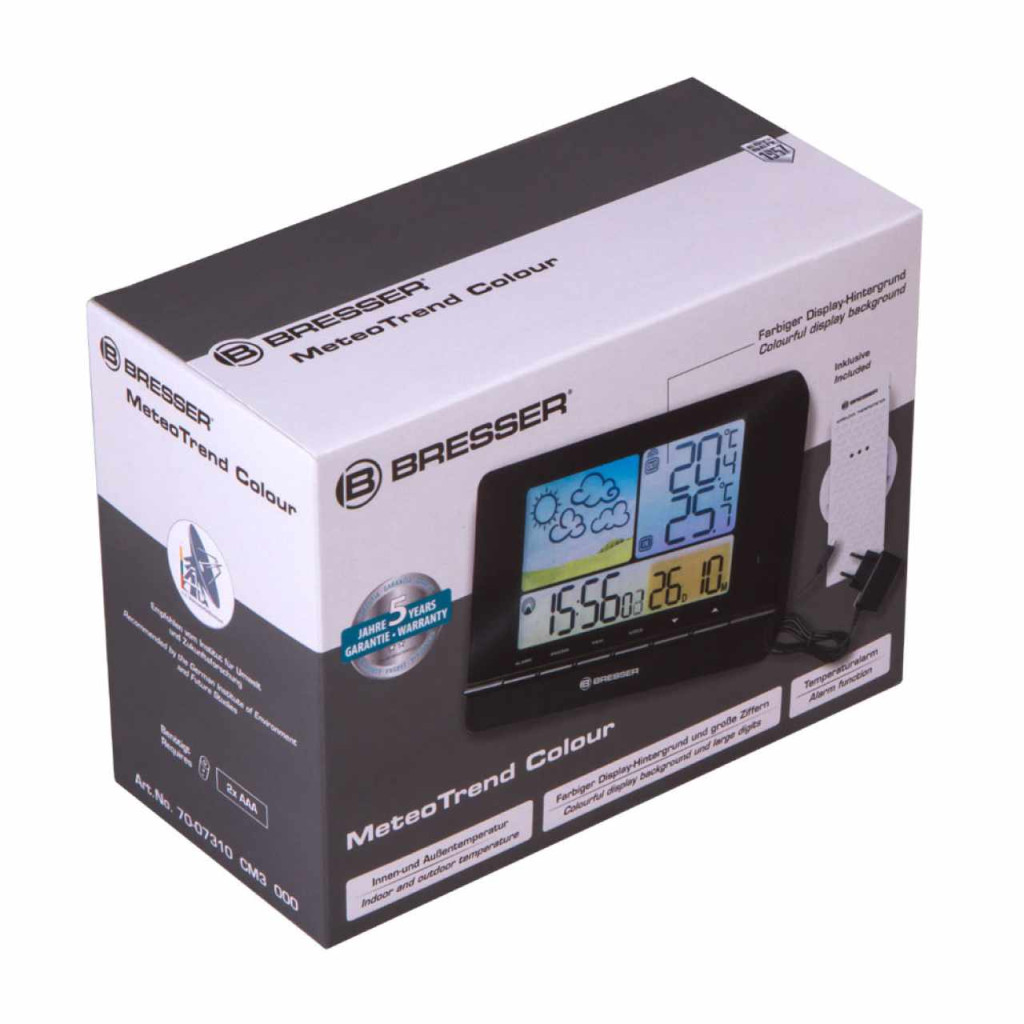 Tájékoztat az időjárásról , A Bresser MeteoTrend Colour RC időjárás-állomás világos színeket visz az életébe! Magas minőségű színes fóliával ellátott kijelzővel, fehér háttérvilágítással és külső érzékelővel rendelkezik. A fő állomás és a külső érzékelő jelzi a belső és külső hőmérsékletet és páratartalmat. Használjon egy 5 lépésből álló időjárás ikont az előrejelzés megtekintéséhez.