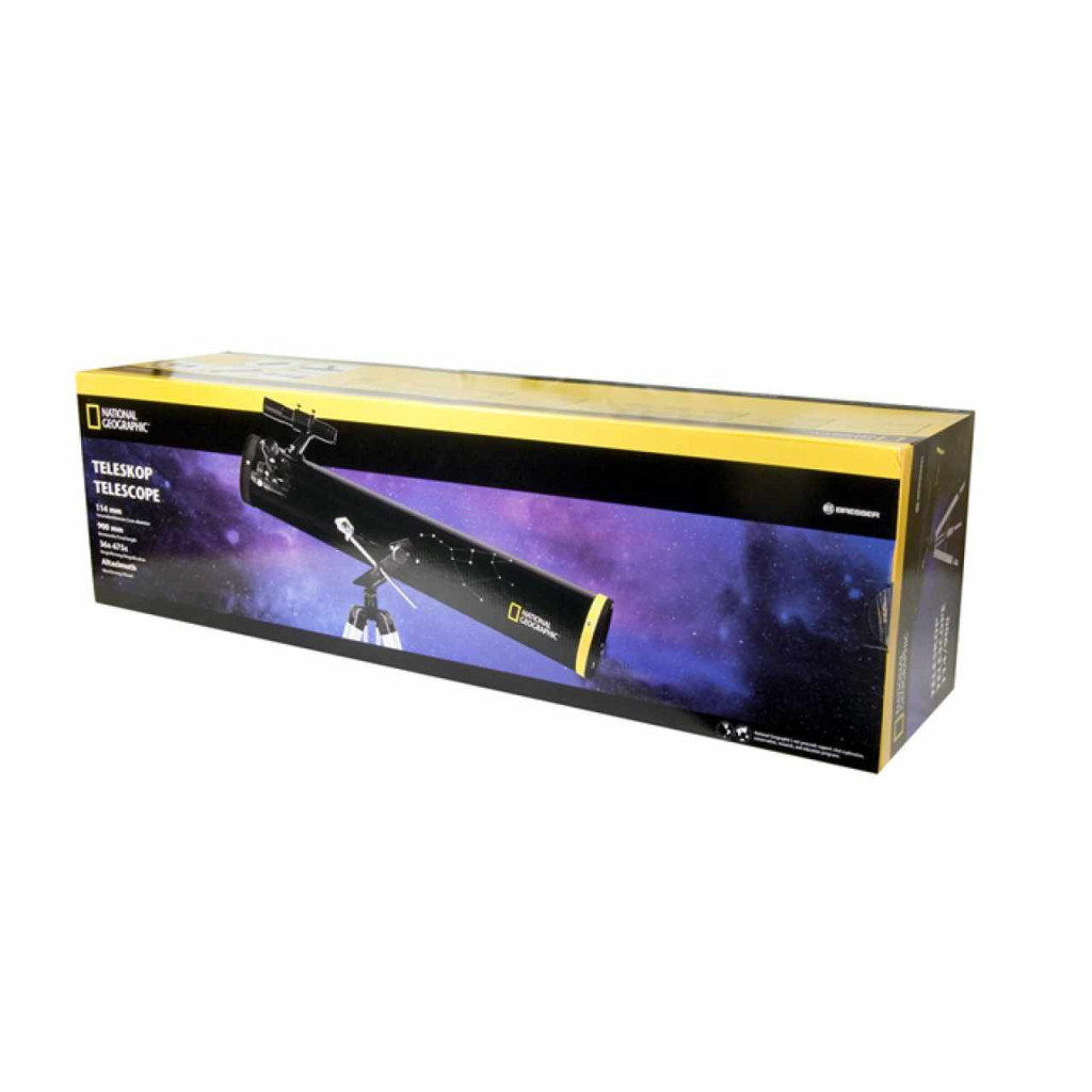 A teljesen felszerelt, valamint a használhatóságot megkönnyítő azimut állvánnyal is ellátott Bresser National Geographic 114/900 AZ teleszkóp ideális választás lehet a csillagászattal most ismerkedő személyek számára. Ez a nagyméretű elsődleges tükörrel ellátott, klasszikus Newton-reflektor nemcsak a nagy bolygókat, hanem a fényes mélyég-objektumokat is megmutatja. A széles látómezejű, nagyteljesítményű, 6x30-as optikai keresőnek köszönhetően a csillagos égbolton gyorsan megtalálhatók a kívánt objektumok. Az eszköz alapkonfigurációban 36-szorostól 67-szeresig terjedő nagyítási fokot kínál. A tükrön található speciális védőbevonat egyfelől meghosszabbítja a tükör élettartamát, másrészt megelőzi a sötétedést. Az állítható magasságú, masszív és stabil kialakítású, alumíniumból készült háromlábú állvány az egész szerkezet számára megfelelő stabilitást nyújt.