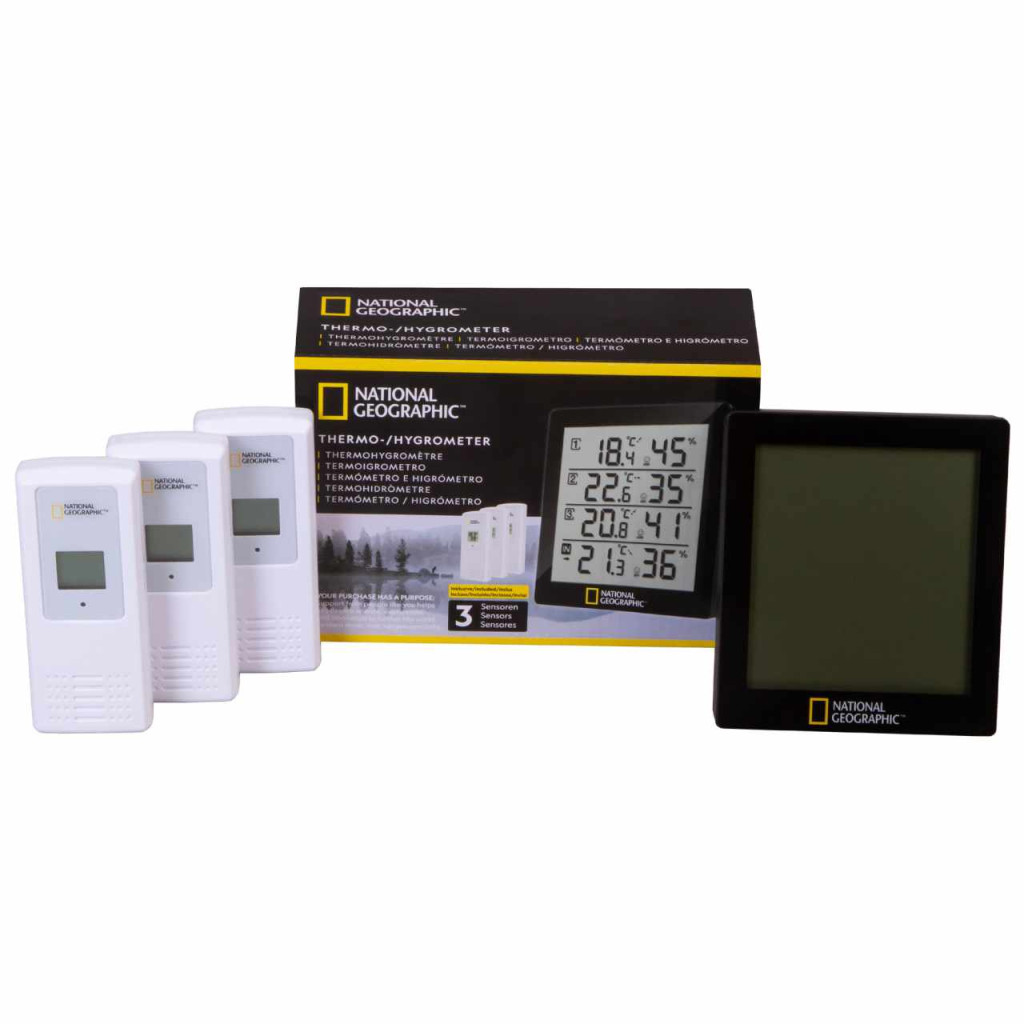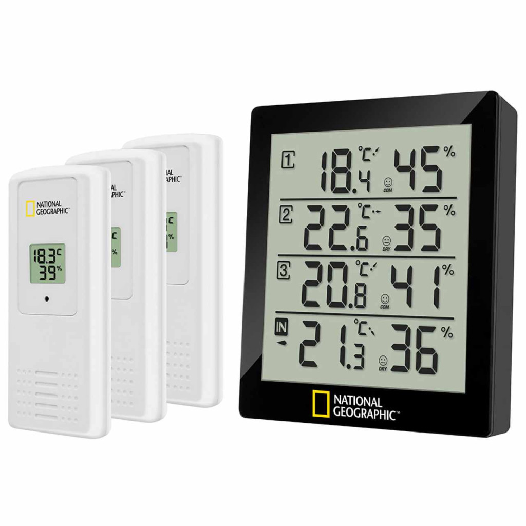 The National Geographic thermo-hygrometer offers the possibility to measure temperature and air humidity in or around your house at 4 different locations, with simple monitoring at one location: Is my cellar room too moist and threatened by mould? Is the children's bedroom temperature all well? Is it too hot on the terrace? There are many more options open.