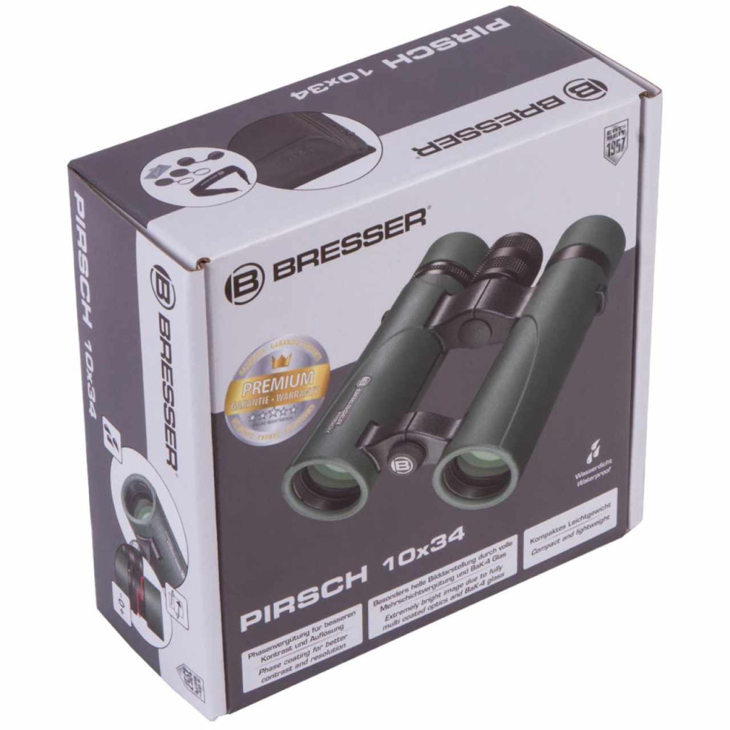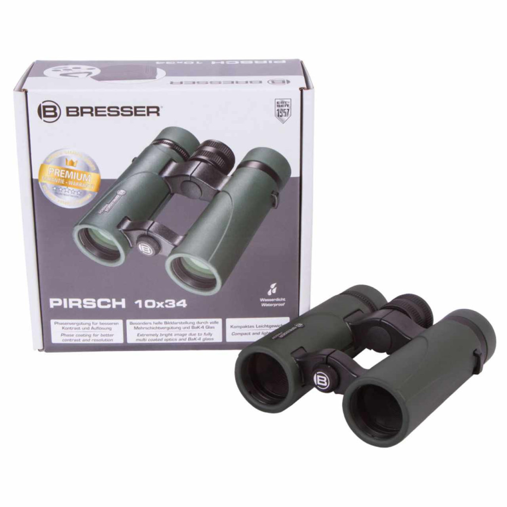 A teljesen és több rétegben bevonatolt, valamint fázisbevonattal is ellátott, minőségi BAK-4 típusú üvegből készült optikai elemek élethű színvilágú, világos, kontrasztos és éles képeket állítanak elő. Az ebben a termékcsaládban található kétszemes távcsövek tekerhető szemkagylókkal rendelkeznek, hogy ezeket az eszközöket a szemüveget viselő személyek is kényelmesen használhassák. A szemkagylók pozíciója mindössze kép lépésben, könnyen állítható. A gumírozott ház segít biztonságosabban és könnyebben kézben tartani az eszközt, míg a nitrogéntöltés megakadályozza az optikai elemek párosodását, valamint vízállóvá teszi a kétszemes távcsövet. Az objektívek és a szemlencsék külön-külön sapkákkal rendelkeznek. A Bresser Pirsch 10x34 kétszemes távcső csomagjában egy nagyon kényelmes nyakpánt, valamint egy nagyon kényelmes hordtáska is található.