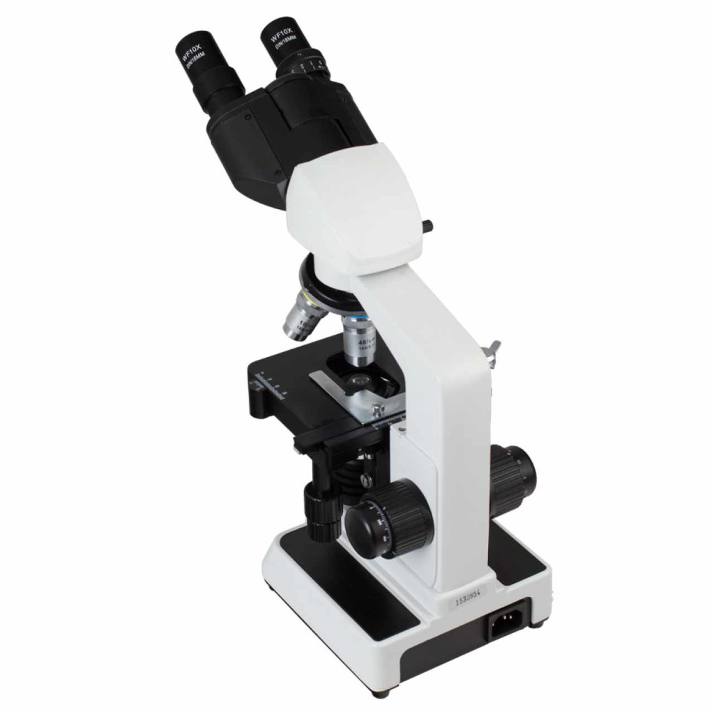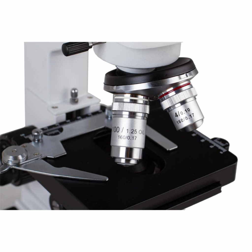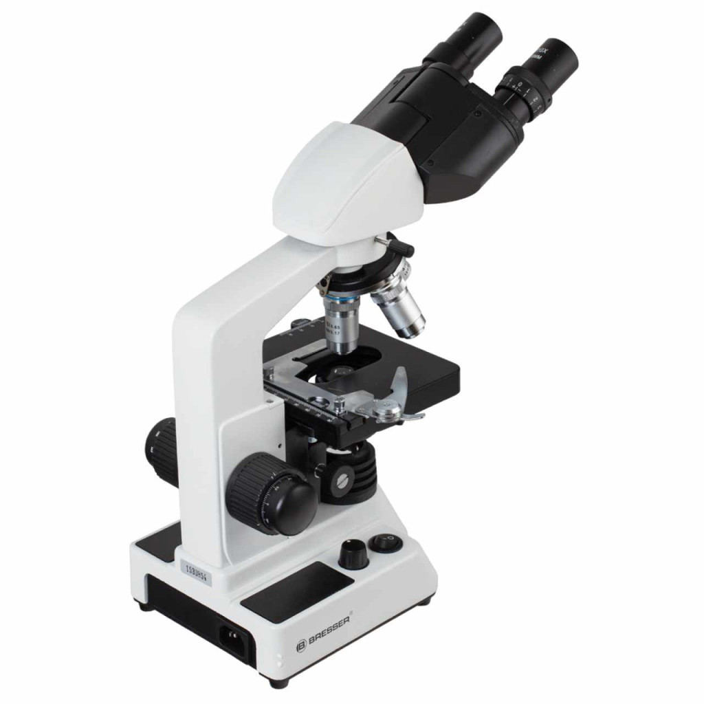 Biológiai binokuláris mikroszkóp , A Bresser Researcher Bino professzionális felhasználásra tervezett, áteső fényű világítást kínáló, briliáns optikai elemekkel, valamint tartós, fém vázzal rendelkező binokuláris (kétszemlencsés) mikroszkóp. Ez a készülék biológiai és gyógyászati célú munkákhoz, valamint oktatáshoz is tökéletes választás lehet. A kényelmes binokuláris fejrész a megfigyelő igényeinek megfelelően, önállóan állítható. A revolverfejen található négy objektívlencse 40-től 1000-szeresig terjedő nagyítási fokot kínál. A csomaghoz mellékelt 100-szoros nagyítási fokú lencsének köszönhetően ez a mikroszkóp olajimmerziós (olajba merítéses) technikával is használható. A Vernier-skálás tárgyasztalnak, valamint a durva-, illetve finomállításra szolgáló két tárcsának köszönhetően egyidejűleg akár két minta is rögzíthető, és az objektum a lehető legpontosabban pozicionálható az objektív alatt. A megfigyelni kívánt objektum tökéletes megvilágításáról egy nagyteljesítményű, 20 wattos LED-izzó, valamint egy írisz diafragmás Abbe kondenzor gondoskodik. A műszer 200 V-os, váltakozófeszültségű (AC) elektromos hálózatról működtethető. Ez a mikroszkóp a csomagban mellékelt többféle tartozékkal is felszerelhető. Ehhez a modellhez gyárilag hordtáska is tartozik.