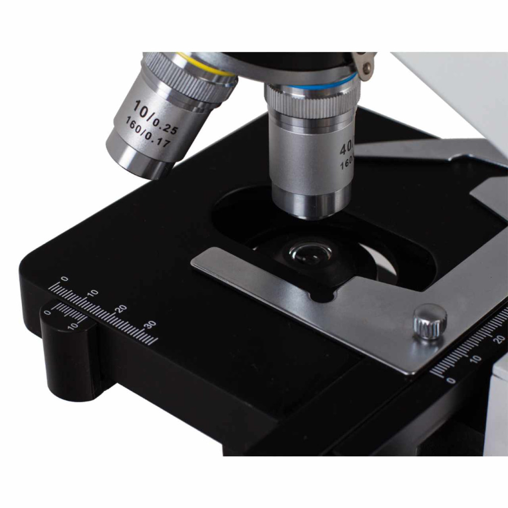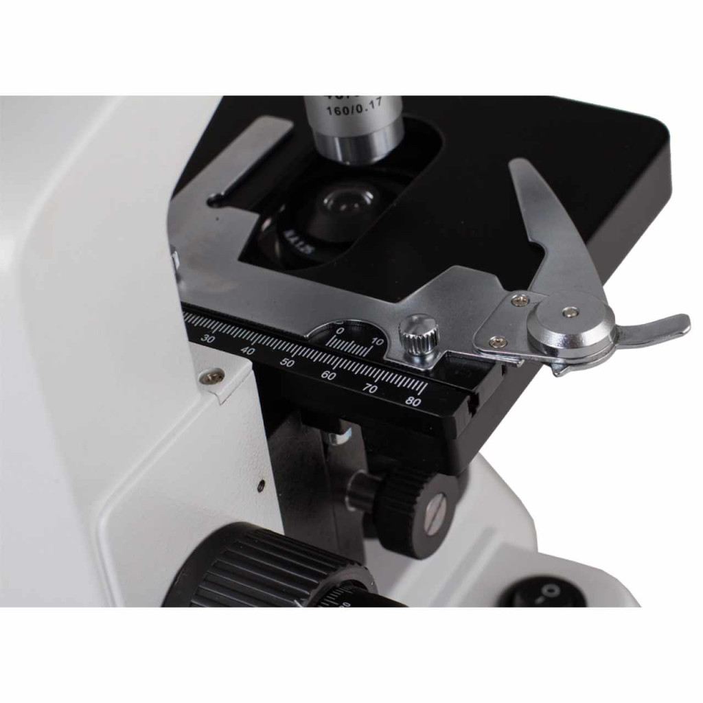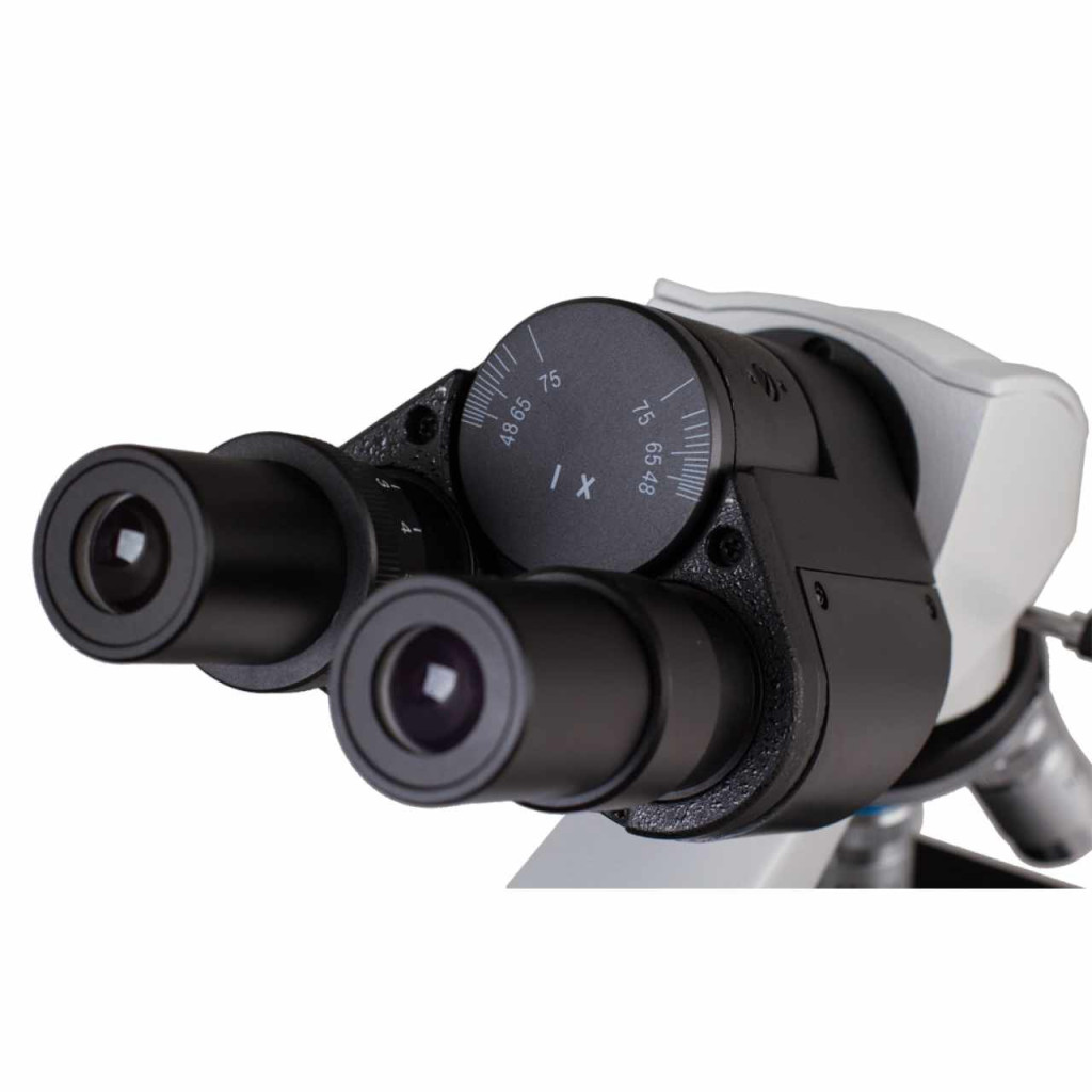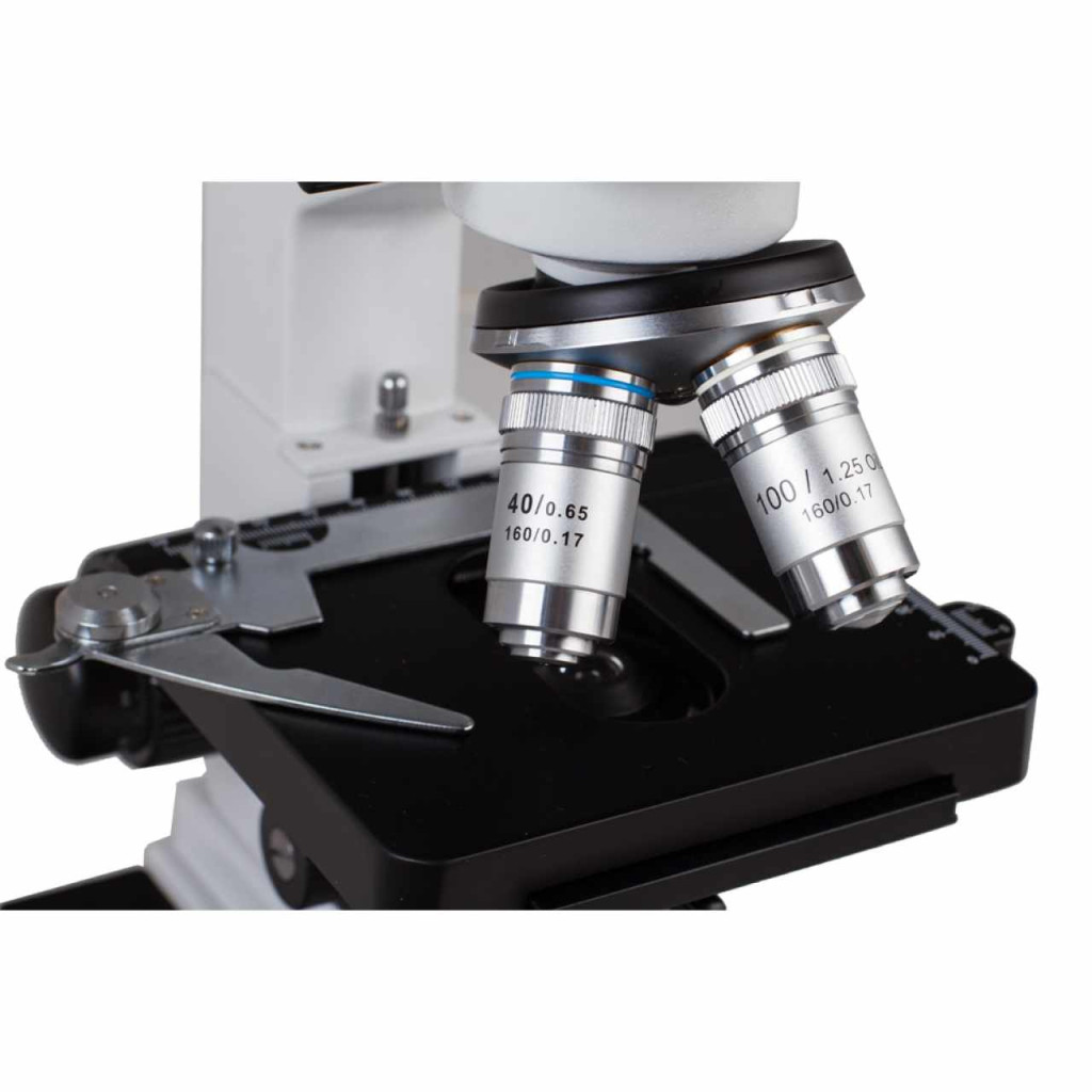 Biológiai binokuláris mikroszkóp , A Bresser Researcher Bino professzionális felhasználásra tervezett, áteső fényű világítást kínáló, briliáns optikai elemekkel, valamint tartós, fém vázzal rendelkező binokuláris (kétszemlencsés) mikroszkóp. Ez a készülék biológiai és gyógyászati célú munkákhoz, valamint oktatáshoz is tökéletes választás lehet. A kényelmes binokuláris fejrész a megfigyelő igényeinek megfelelően, önállóan állítható. A revolverfejen található négy objektívlencse 40-től 1000-szeresig terjedő nagyítási fokot kínál. A csomaghoz mellékelt 100-szoros nagyítási fokú lencsének köszönhetően ez a mikroszkóp olajimmerziós (olajba merítéses) technikával is használható. A Vernier-skálás tárgyasztalnak, valamint a durva-, illetve finomállításra szolgáló két tárcsának köszönhetően egyidejűleg akár két minta is rögzíthető, és az objektum a lehető legpontosabban pozicionálható az objektív alatt. A megfigyelni kívánt objektum tökéletes megvilágításáról egy nagyteljesítményű, 20 wattos LED-izzó, valamint egy írisz diafragmás Abbe kondenzor gondoskodik. A műszer 200 V-os, váltakozófeszültségű (AC) elektromos hálózatról működtethető. Ez a mikroszkóp a csomagban mellékelt többféle tartozékkal is felszerelhető. Ehhez a modellhez gyárilag hordtáska is tartozik.