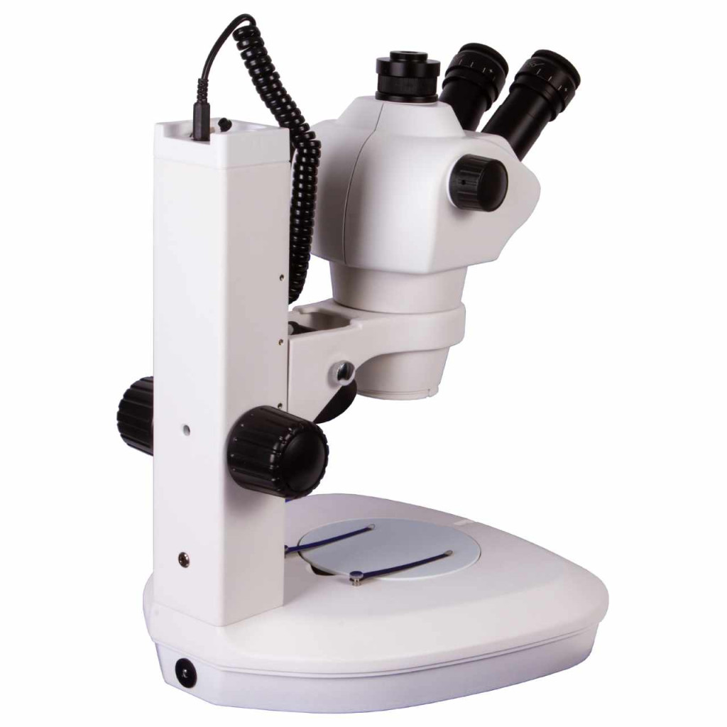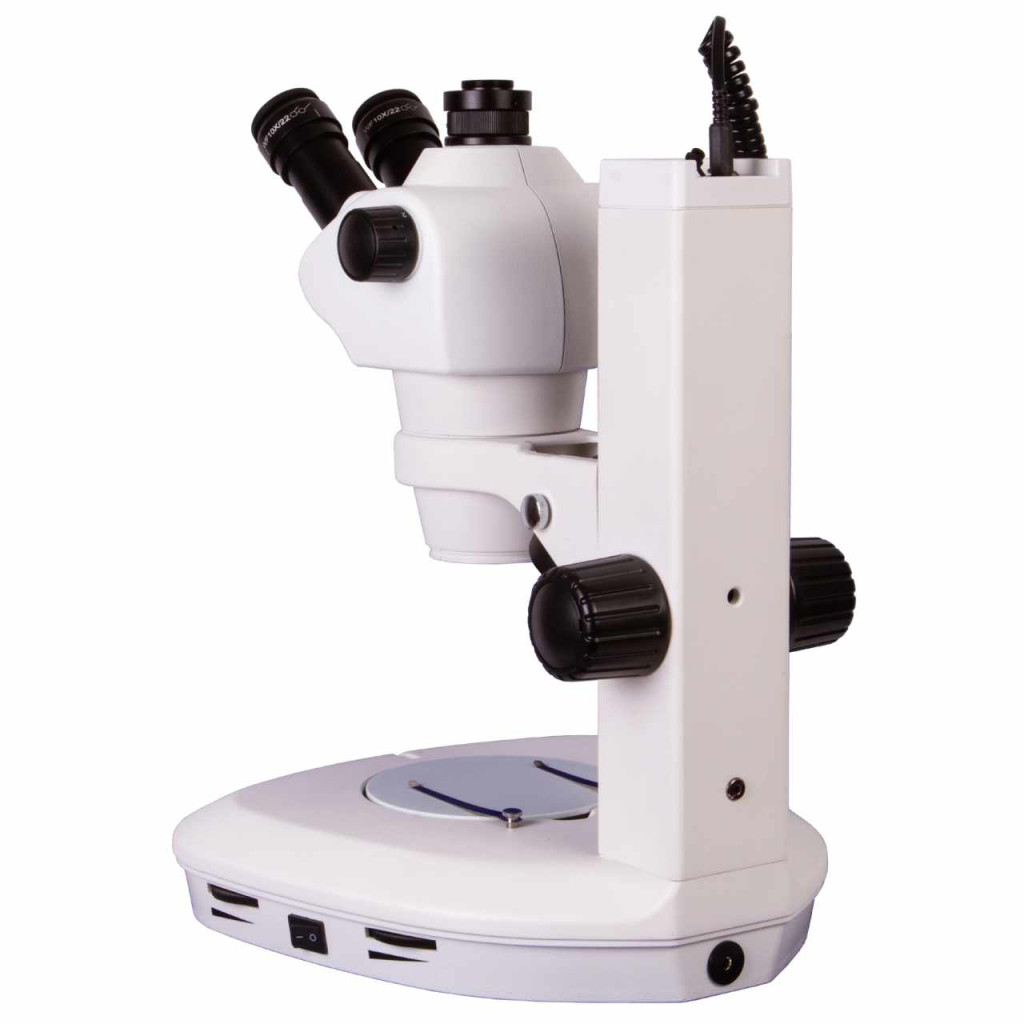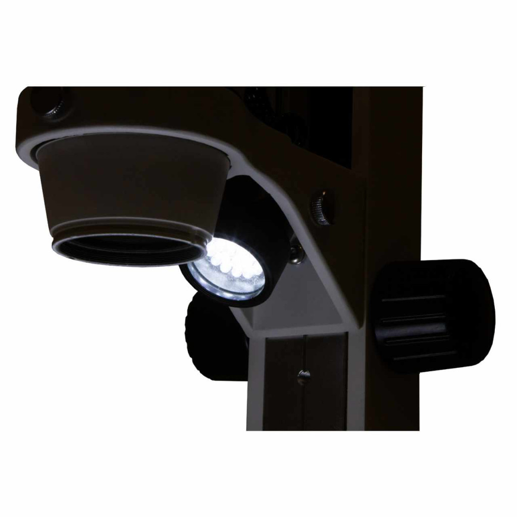 The extra wide foot with stage and exceptionally tall height range permit observations of large objects. The integrated reflected- and transmitted-light illumination can be used in combination and is dimmable. The angle of incidence can be user-friendly adjusted and locked in position. A continuous range of magnification from 8x to 50x is possible with the exchangeable wide field eyepieces (WF10x) and the 6.25-times stereo zoom objective lens (0.8x–5x).