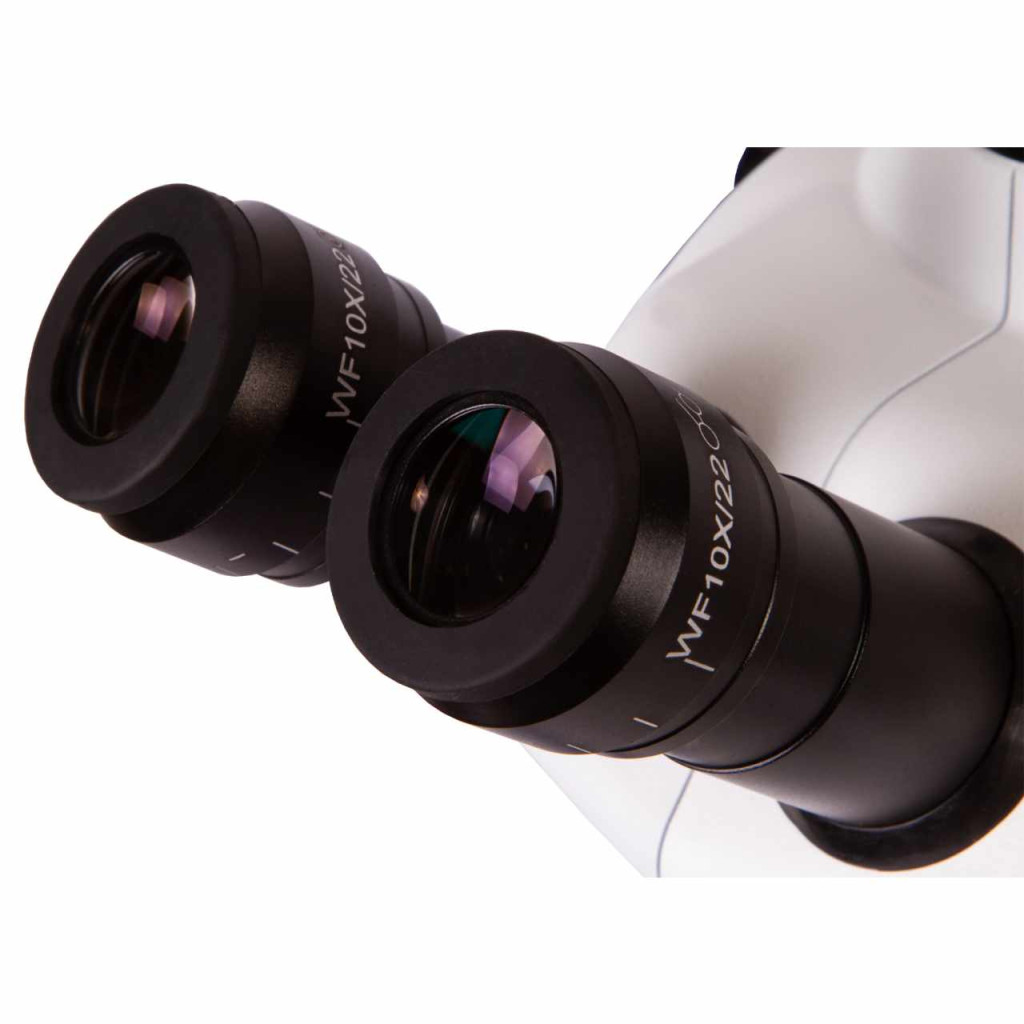 The interpupillary distance and dioptre compensation can be adjusted individually. The trinocular microscope head is rotatable (360°) and comes with two 45° inclined eyepiece tubes and a separate camera tube for the attachment of a c-mount camera or MikroCam.