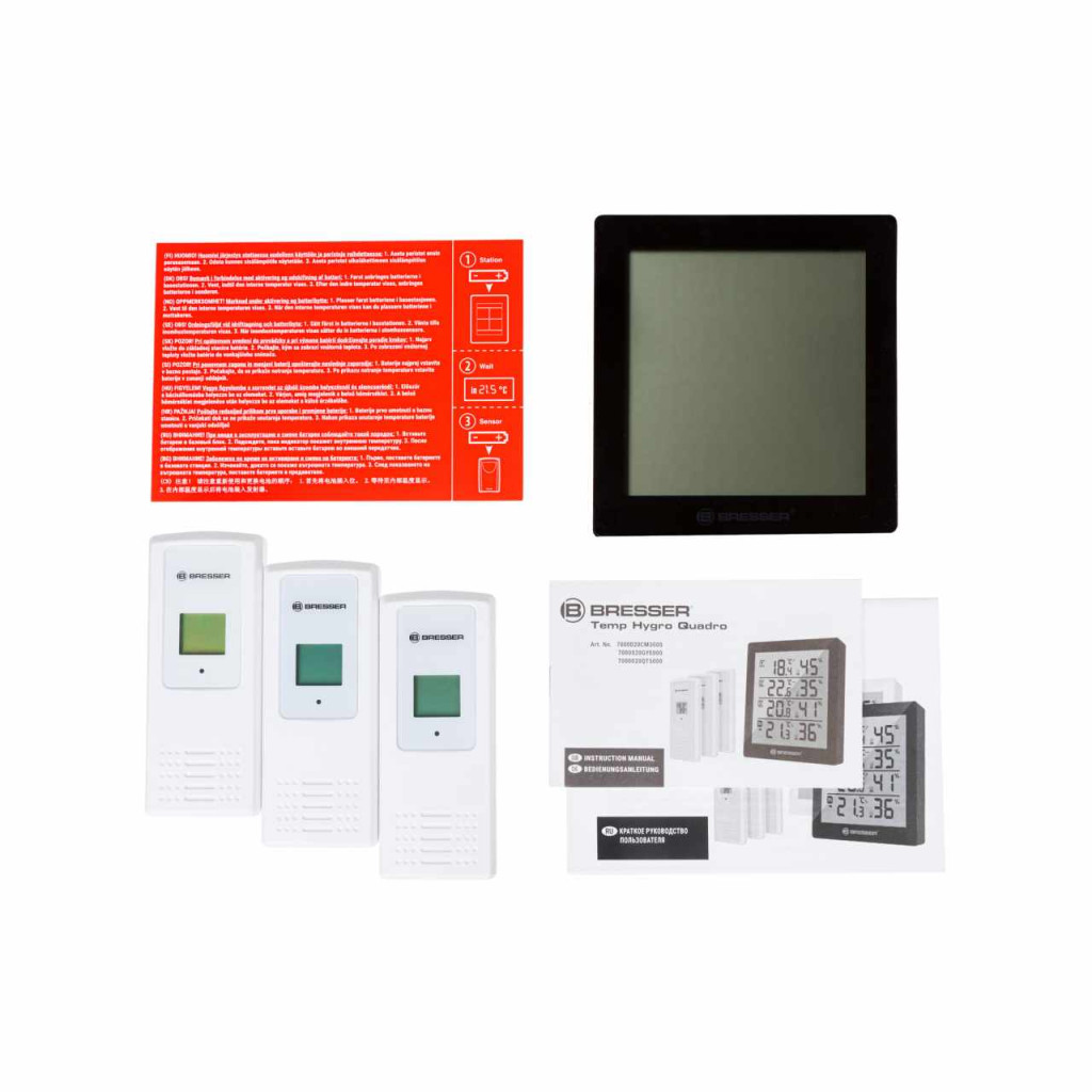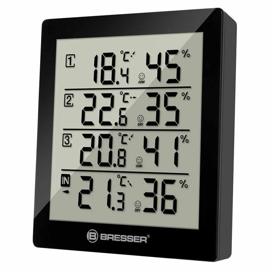 The Bresser Temeo Hygro Quadro offers the possibility to measure temperature and air humidity in or around your house at 4 different locations. This enables the simple monitoring at one location: Is my cellar room too moist and threatened by mold? Is the children's bedroom temperature all well? Is it too hot on the terrace? There are many more options open.
