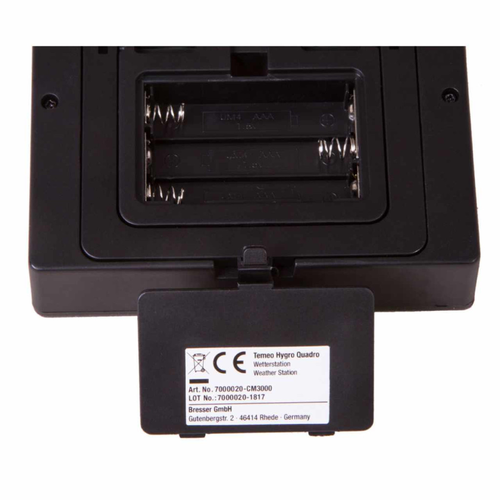 Battery powered by 3x AAA/LR03 batteries (main station) and 6x AAA/LR03 batteries (for the three sensors).