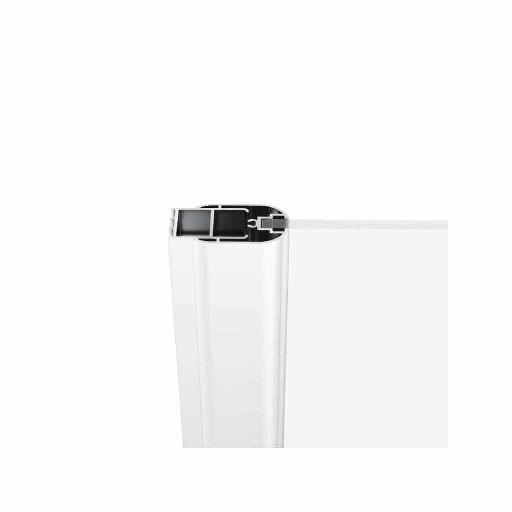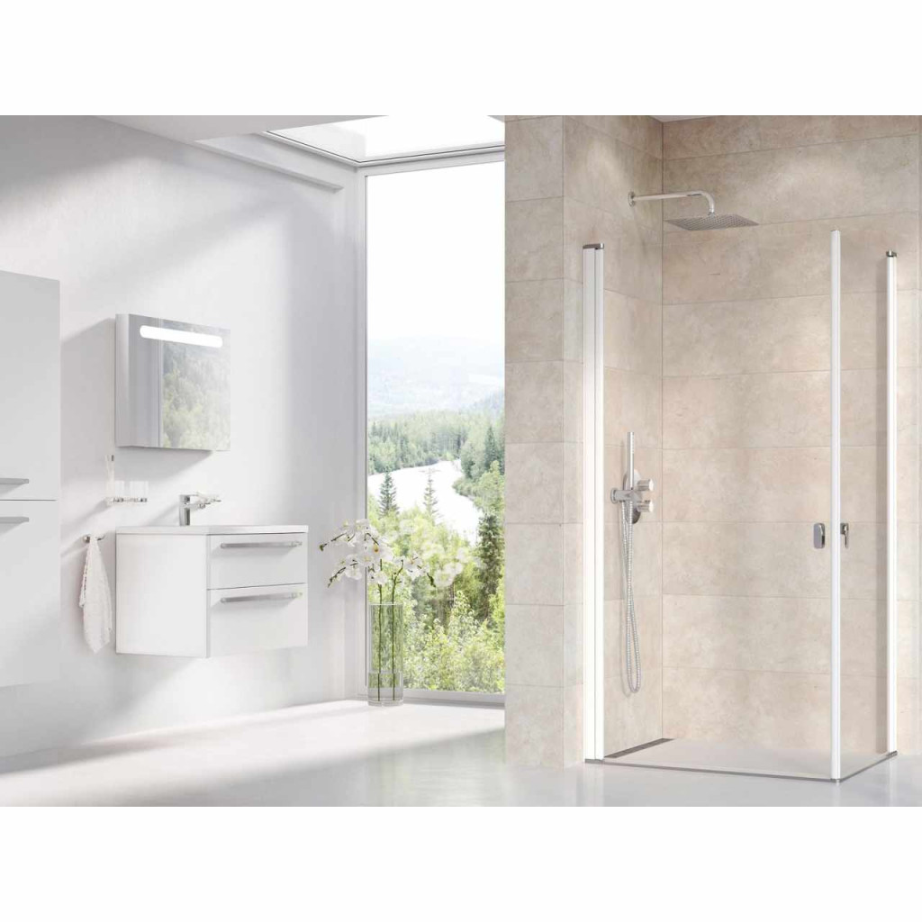 Chrome sarokzuhanykabin egy oldala, fehér kerettel, átlátszó, edzett biztonsági üveggel, Ravak Anticalc® vízlepergető réteggel. A zuhanykabin kialakításához a terméket CRV1, CRV2 zuhanyajtóval vagy CPS fix fallal kombinálják. Nyílóajtós rendszer.