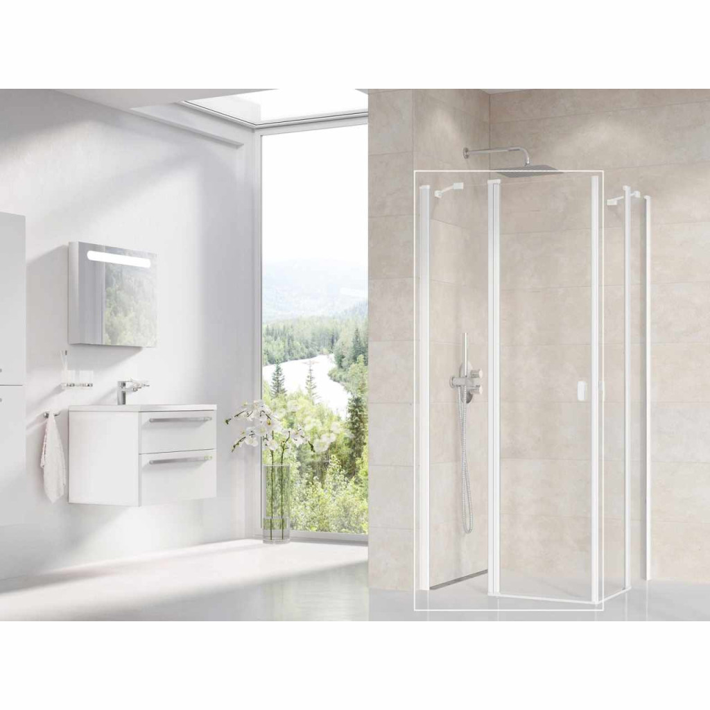 Chrome sarokzuhanykabin egy oldala, matt fehér kerettel, átlátszó, edzett biztonsági üveggel, Ravak Anticalc® vízlepergető réteggel. A zuhanykabin kialakításához a terméket CRV1, CRV2 zuhanyajtóval vagy CPS fix fallal kombinálják. Nyílóajtós rendszer.