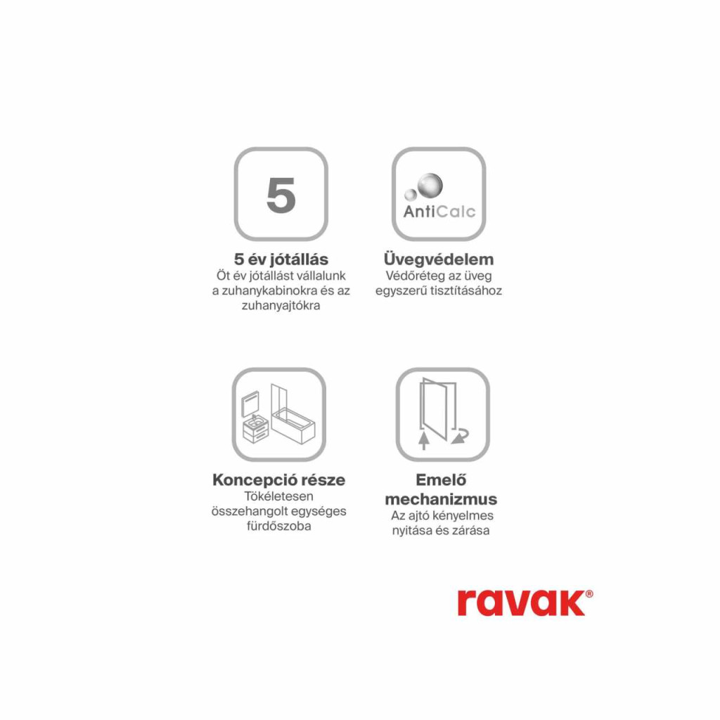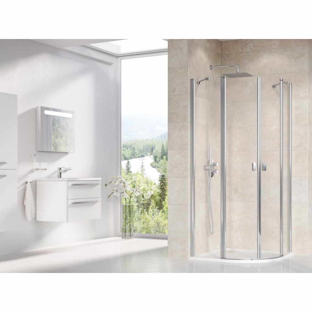 Chrome négyrészes, negyedköríves zuhanykabin, krómhatású kivitelben, átlátszó biztonsági üveggel, Ravak AntiCalc® vízlepergető réteggel. Nyílóajtós rendszer.