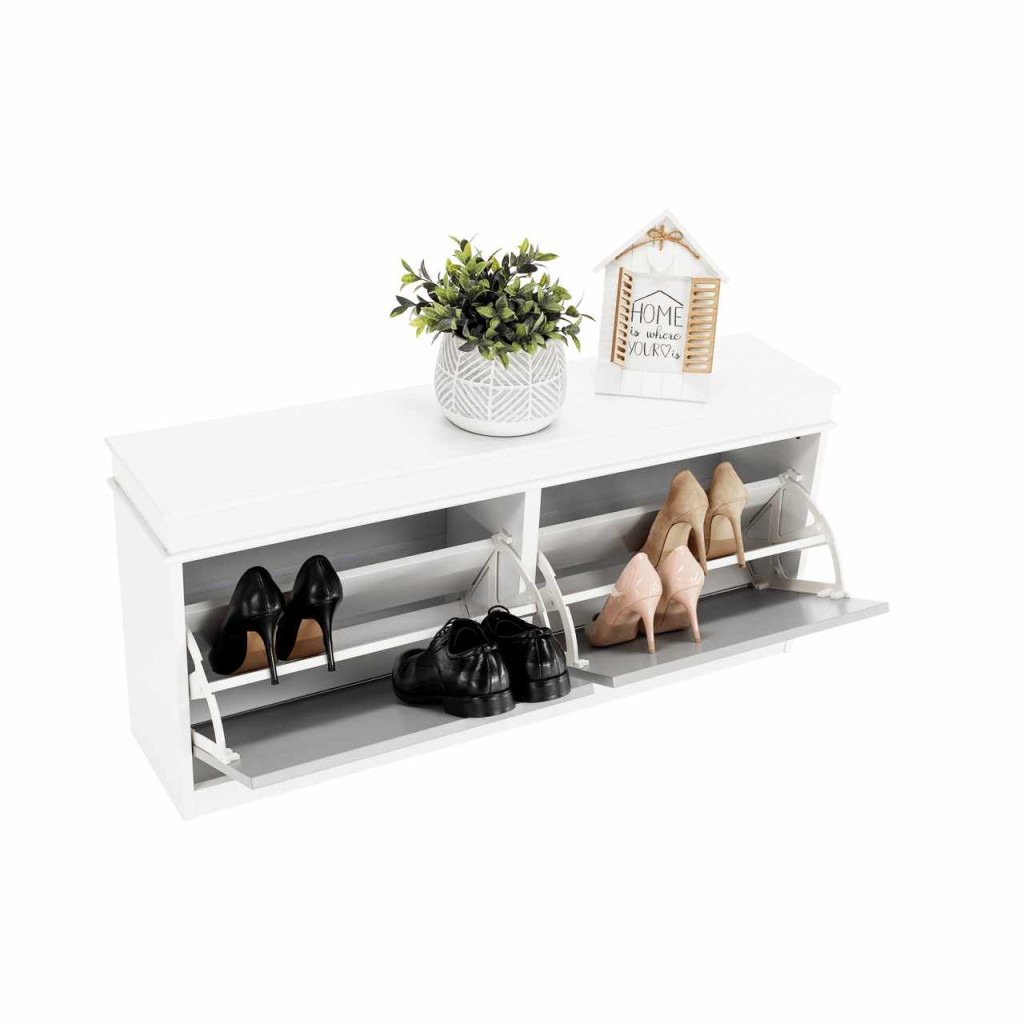 Szín: fehér/szürkeAnyag: MDF/forgácslap Méretek (SzéxMéxMa): 104x24x47,5 cm 2 soros 8 pár cipőhöz alkalmas Billenthető fiókokSúly: 16,4 kgTeherbírás: 60 kg Bontásban szállítva.