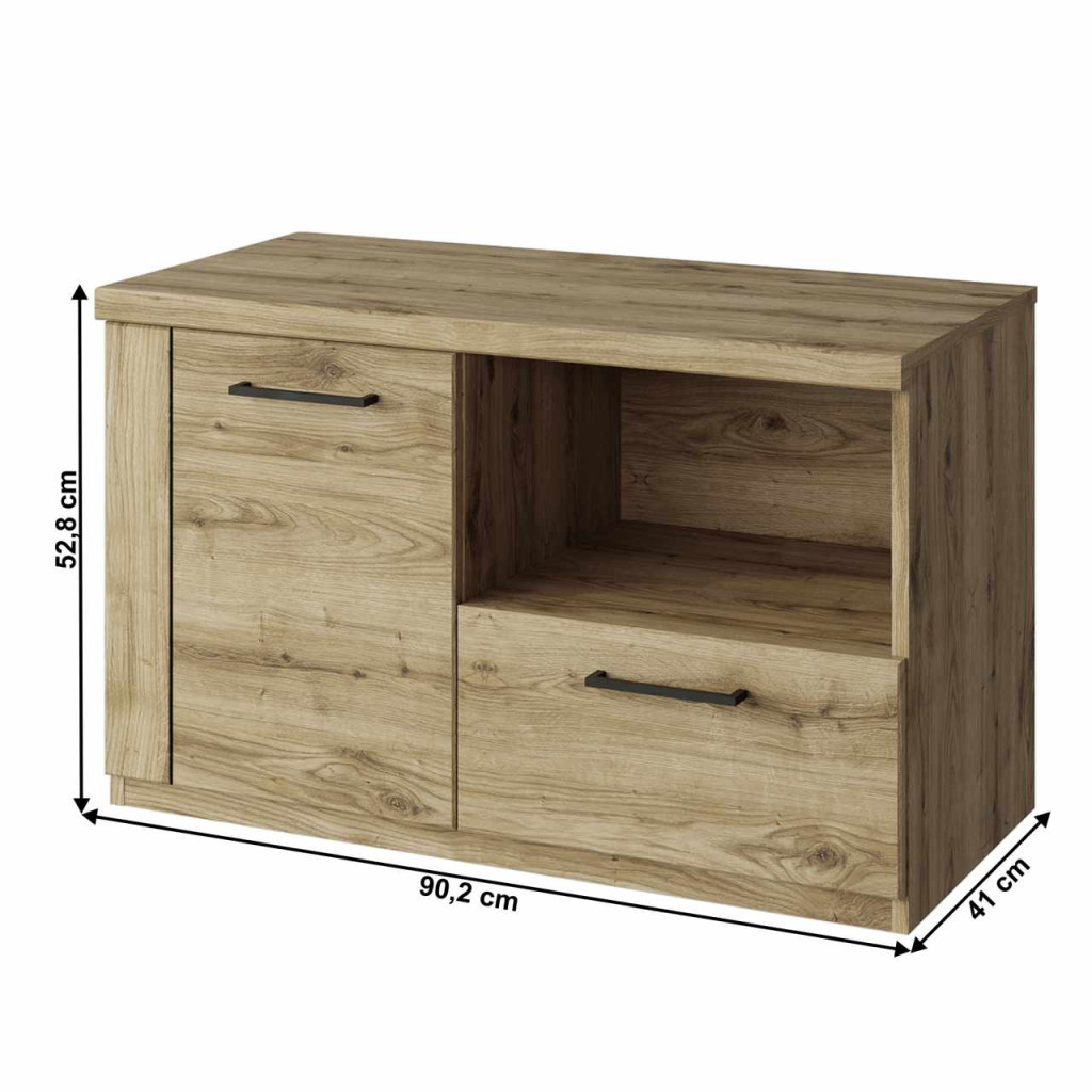 "Cipősszekrény DORSI 1D1S Anyag: laminált DTD/MDF Szín: navarra tölgy Méretek (SzxMéxMa): 90,2x41x52,8 cm Anyag vastagsága: 1,6 cm Kombinált Egyajtós Szekrény polccal Nyitott tárhely Egy fiók Felső lap teherbírása: 10 kg Fiók és polc teherbírása: 3 kg Műanyag fogantyúk Fogantyúk színe: fekete Modern dizájn