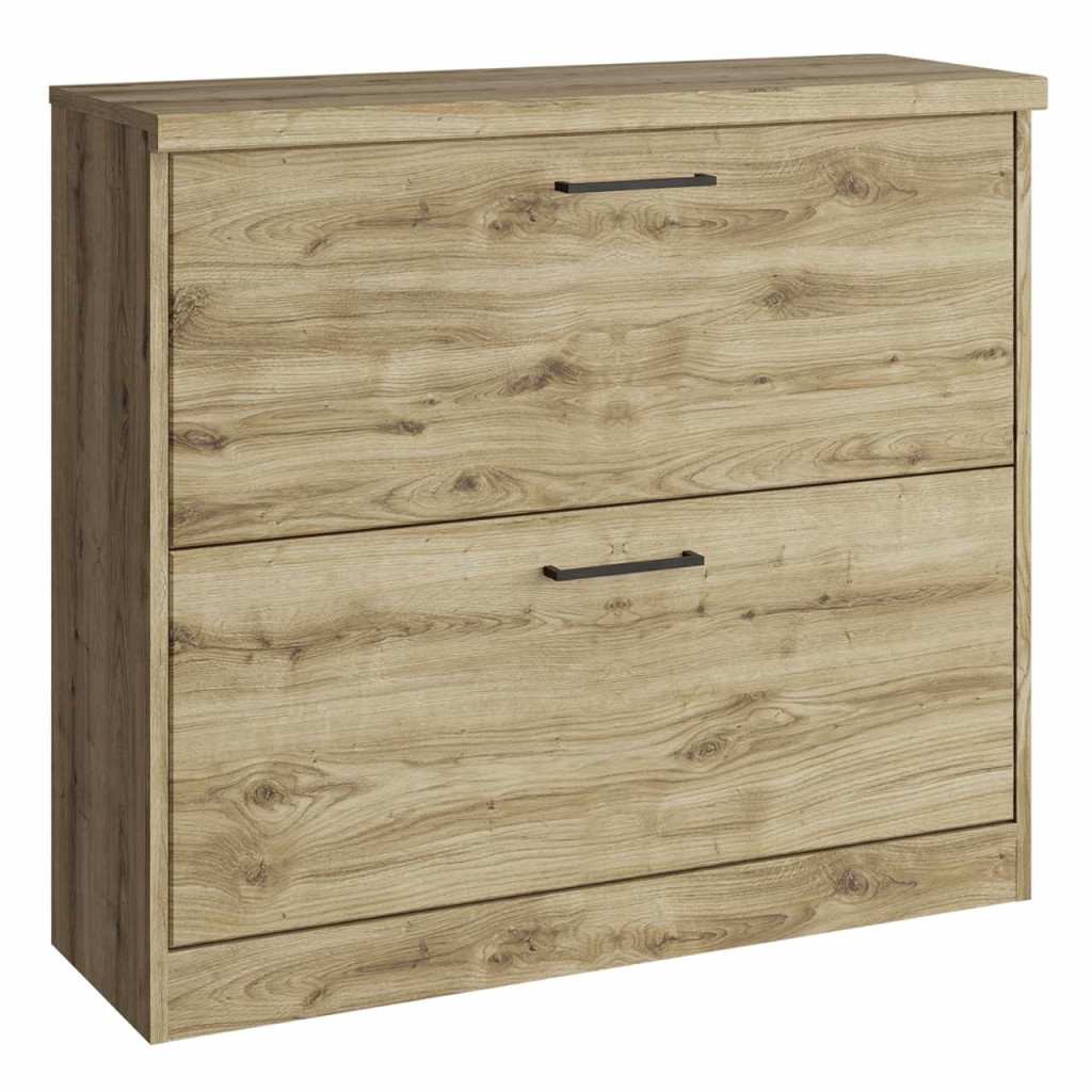 "Cipősszekrény DORSI 2K Anyag: laminált DTD/MDF Szín: navarra tölgy Méretek (SzxMéxMa): 90,2x30,6x80,7 cm Anyag vastagsága: 1,6 cm Két billentős tárolóhely Felső lap teherbírása: 10 kg Billentős fiók teherbírása: 3 kg Műanyag fogantyúk Fogantyúk színe: fekete Modern dizájn