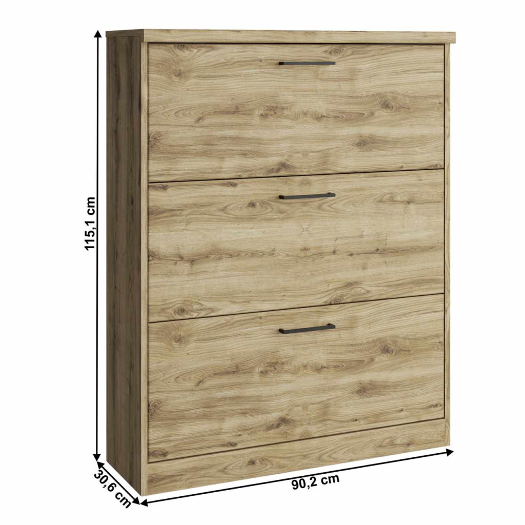"Cipősszekrény DORSI 3K Anyag: laminált DTD/MDF Szín: navarra tölgy Méretek (SzxMéxMa): 90,2x30,6x115,1 cm Anyag vastagsága: 1,6 cm Három billentős tárhely Felső lap teherbírása: 10 kg Billentős fiók teherbírása: 3 kg Műanyag fogantyúk Fogantyúk színe: fekete Modern dizájn