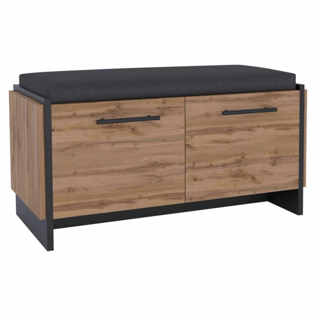 Anyag: laminált DTD/ABS élekKárpit anyaga: szövet Orinoco 96A szövet kopásállósága a Martindale teszt szerint: 45 000 - 50 000 ciklusSzín: wotan tölgy/feketeMéretek (SzxMéxMa): 96x45x45 cmAnyag vastagsága: 1,6 cmFém fogantyúkFogantyúk színe: feketeCipősszekrény teherbírása: 40 kgTárhelyKétajtósAlsó lap teherbírása: 5 kgÜlőpárnával szállítvaÜlőpárna méretei (SzxMéxMa): 90x42x5 cmDupla laminált DTDMűanyag lábakModern dizájnAjánljuk a falhoz rögzíteniSzétszerelve szállítva