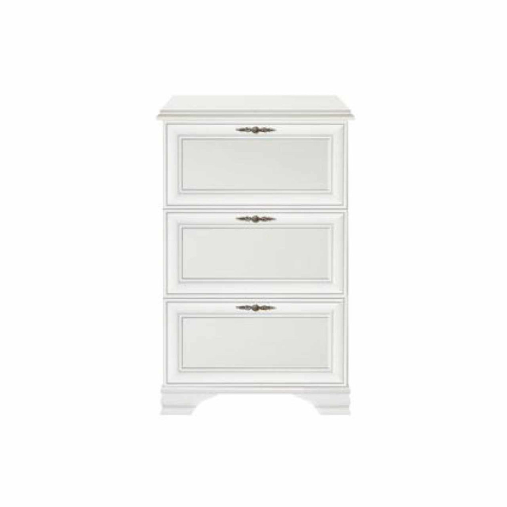 Anyag: laminált DTDSzín: alpesi fehérMéretek (SzxMéxMa): 80x19,5x123 cmAnyag vastagsága: 1,6 cmFém fogantyúkFogantyúk színe: antik ezüstHárom billentős fiókBillentős fiók teherbírása: 3 kgLábakonLábak magassága: 8 cmSzétszerelve szállítva