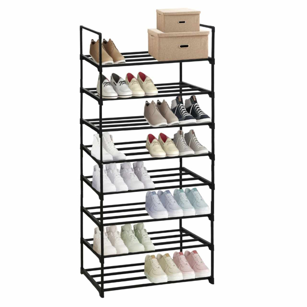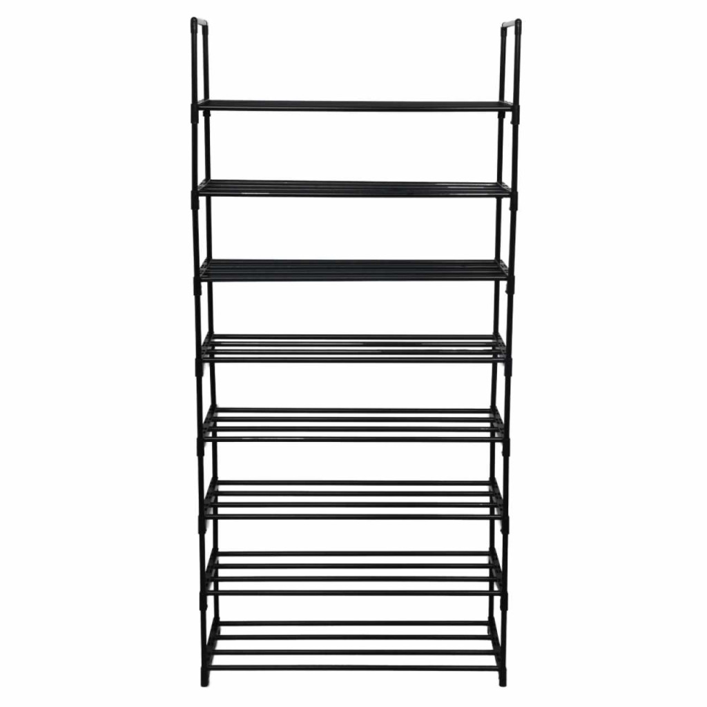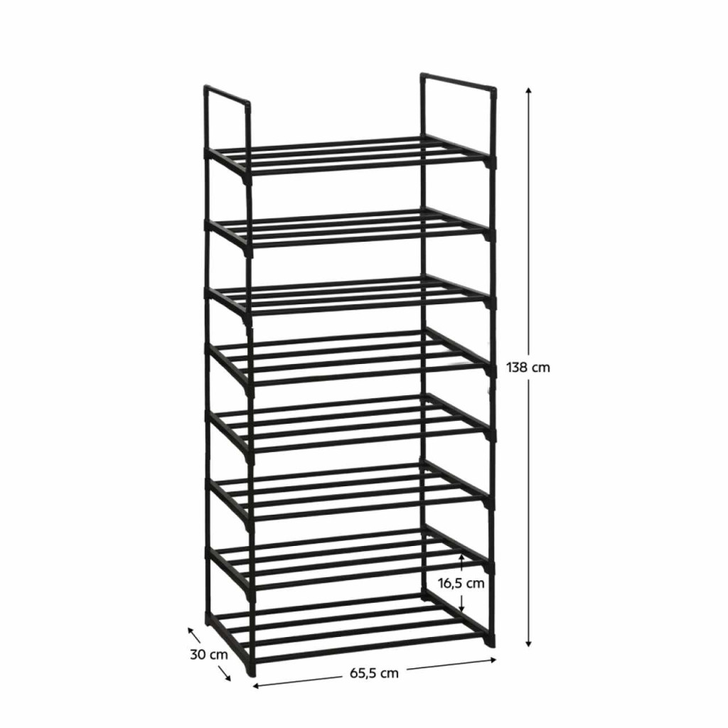 Anyag szerkezet: fém/műanyagSzín: feketeMéretek (SzxMéxMa): 65,5x30x138 cm8 soros cipőtartóMagasság a polcok között: 16,5 cmTeherbírás/polc: 5 kgEgyszerű és praktikusStabil szerkezetEgyszerű összeszerelésKönnyű karbantartásSzétszerelve szállítva