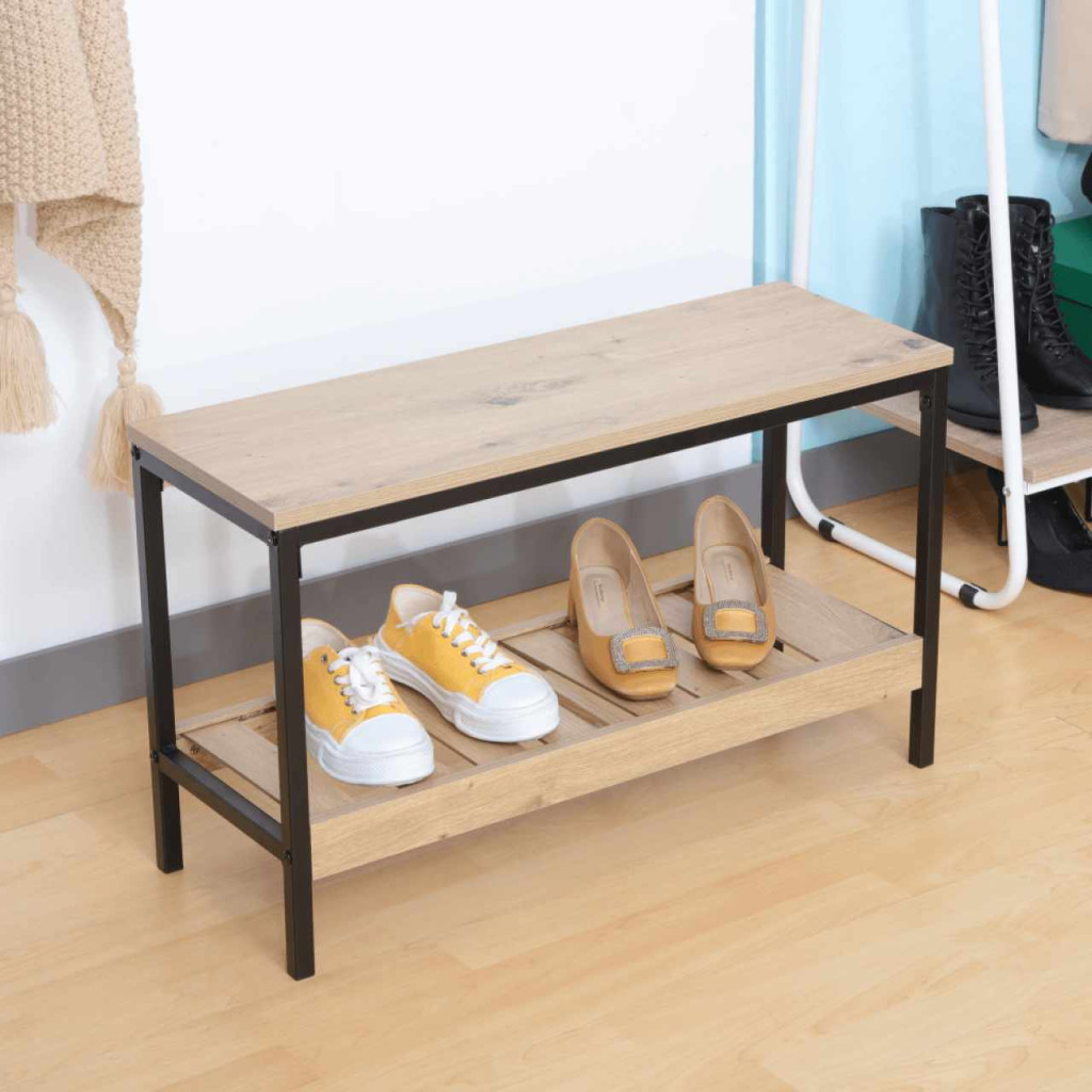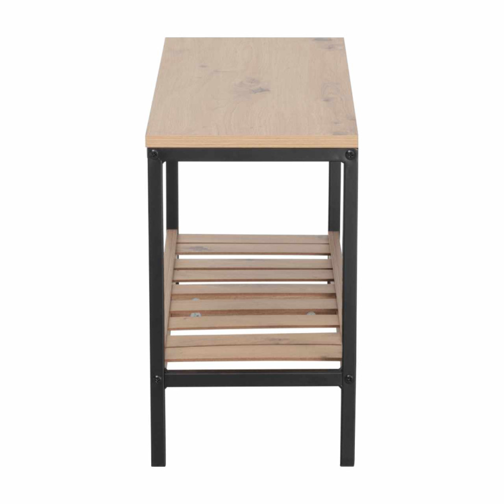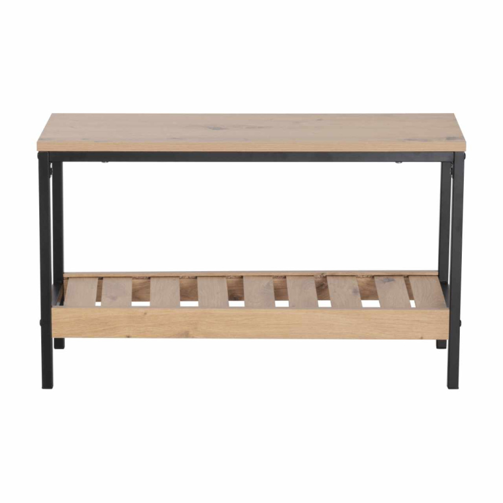 Anyag: laminált DTD/ fémSzín: tölgy/feketeMéretek (SzxMéxMa): 70x26x42 cmAnyag vastagsága: 1,5 cmMagasság a talajtól az első polcig: 9,3 cmÜlőrészPolccalPolcok teherbírása: 2 kgFelső lap teherbírása: 80 kgMagasság a polcok között: 26,8 cmNyitott tárhelyEgyszerű és praktikusSzétszerelve szállítva
