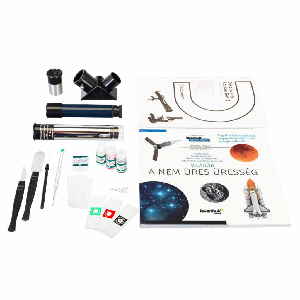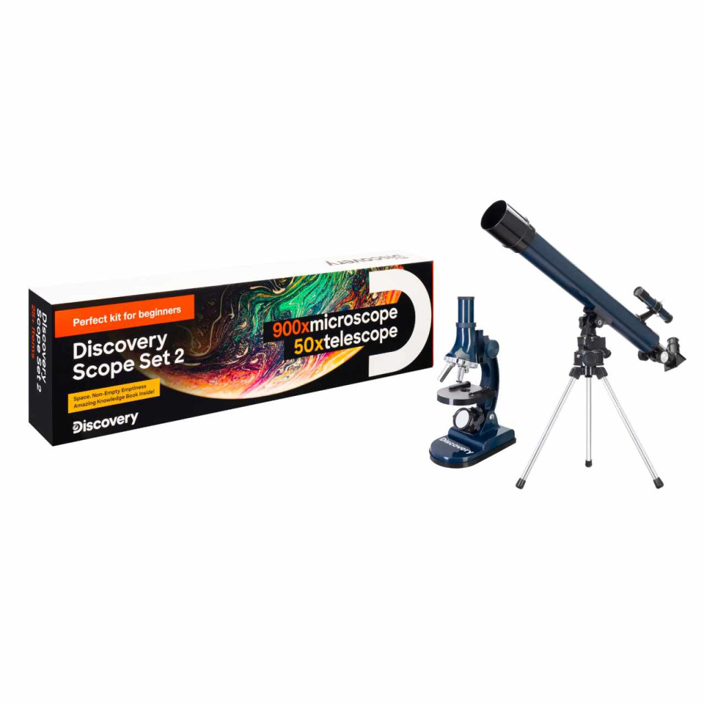 A Discovery Scope 2 készlet két optikai eszközt tartalmaz: egy mikroszkópot és egy teleszkópot. A mikroszkóp nagy segítséget nyújt a mikrobiológia alapjainak elsajátításában. A teleszkóp rendkívül hasznos ahhoz, hogy elsajátíthassa a csillagászat alapjait. Az optikai eszközökön kívül a készlet praktikus tartozékokat tartalmaz, amelyekre szüksége lehet a világ felfedezéséhez és a tudományos kísérletek elvégzéséhez. A készlethez a „Világűr. A nem üres üresség” című ismeretterjesztő könyv is jár.