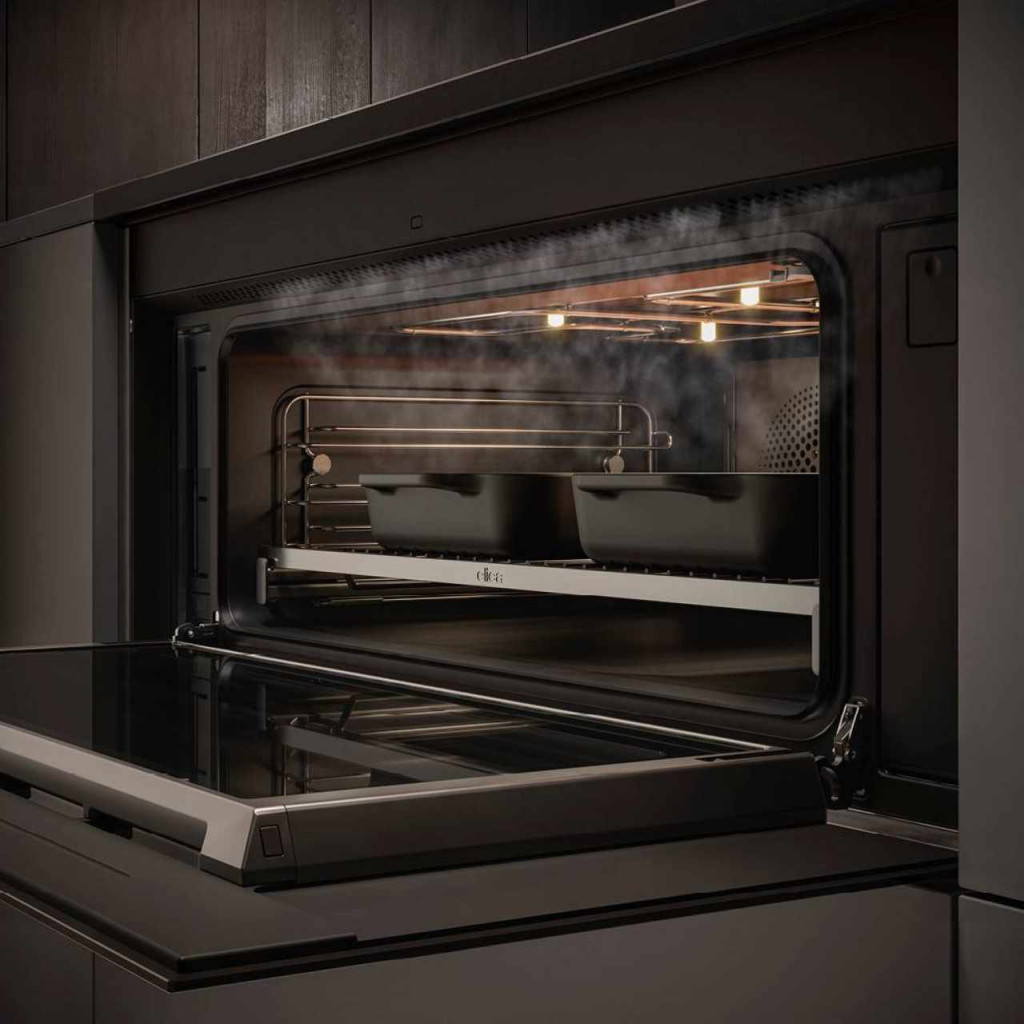 Nincs többé arcba áramló forró levegő. Forradalmi elszívórendszer, amely felfogja a levegőt, automatikusan eltávolítja a gőzöket és a sütőszagokat. Nincs több gőz vagy füst szivárgása a sütő ajtaján.