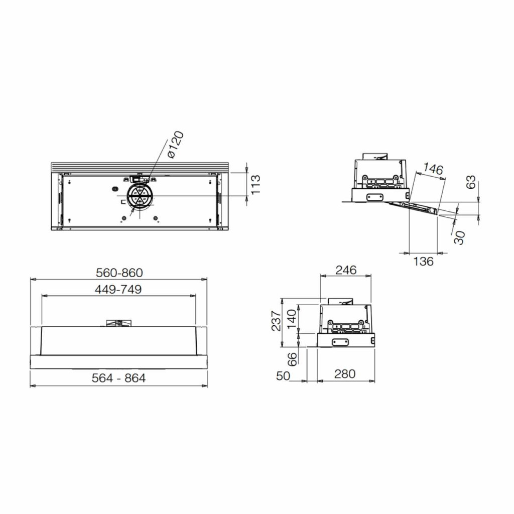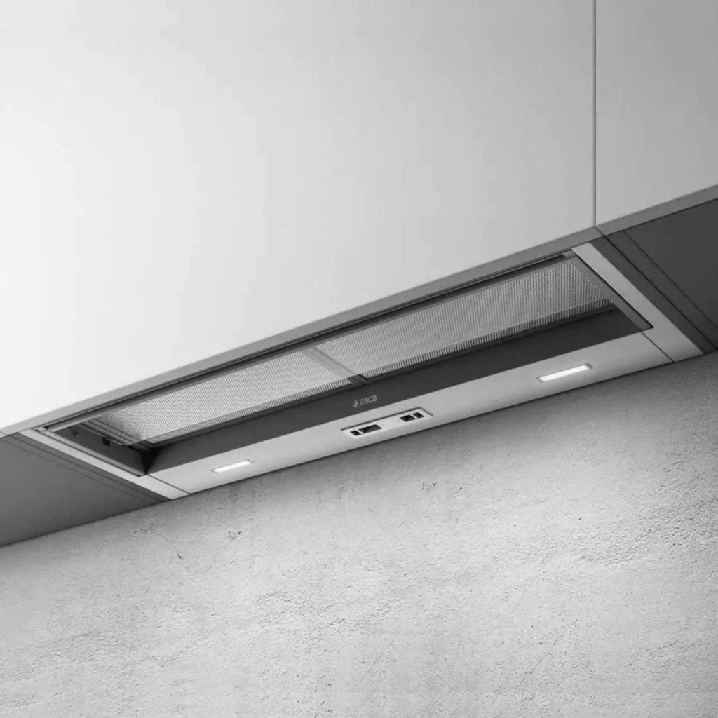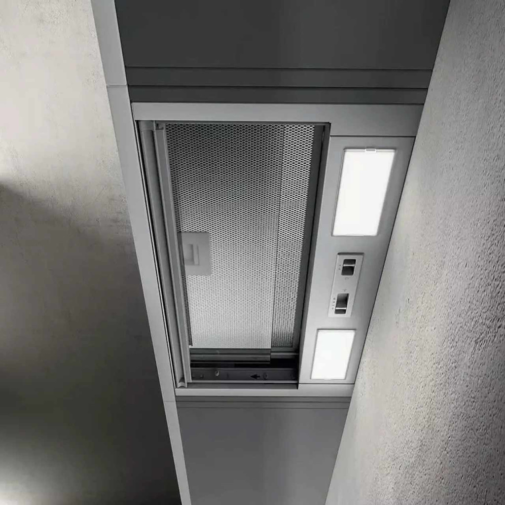 Ez egy minimalista kialakítású, beépített páraelszívó, amelyet úgy terveztek, hogy teljesen elrejthető legyen a fali szekrényben.