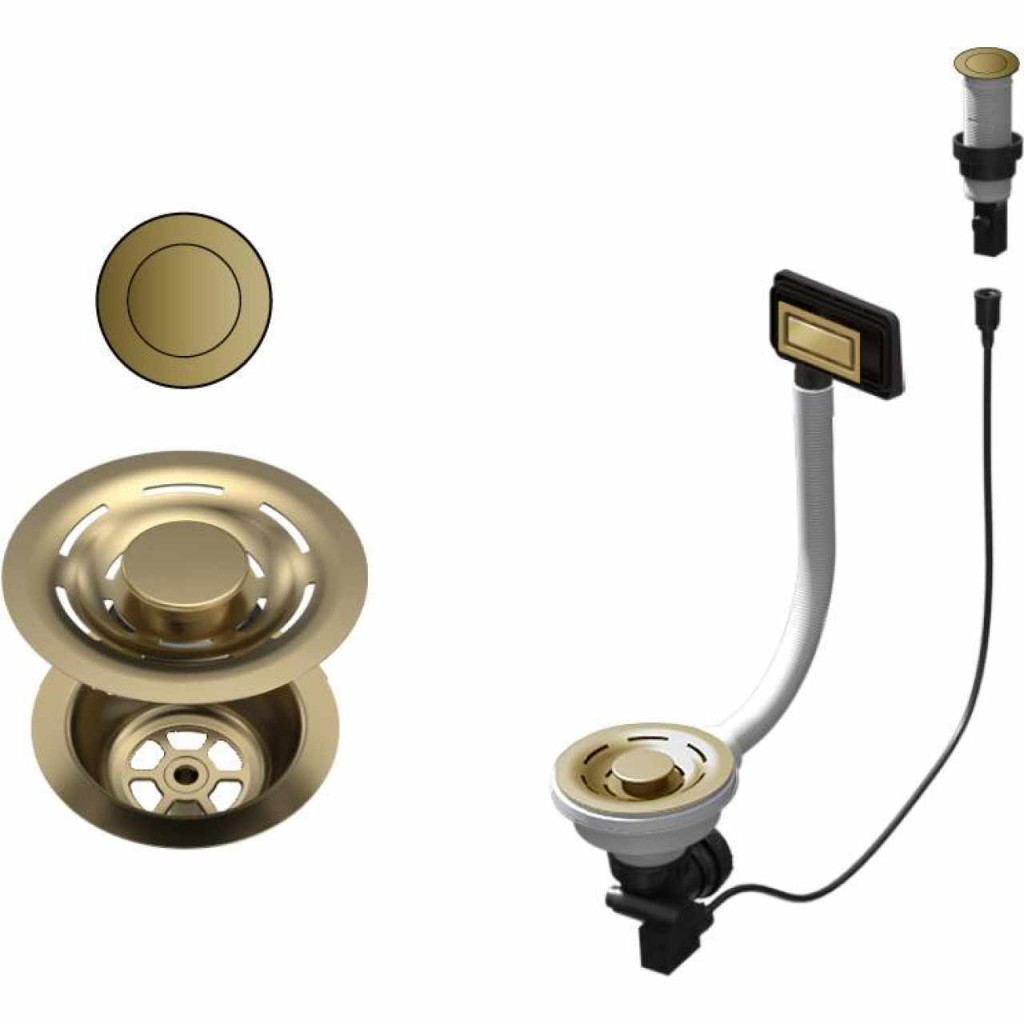 ELLECI - FLOW-PRO OPEN UP (nyomógombos) automata dugókiemelő négyzetes túlfolyóval egymedencés mosogatókhoz arany színben PVD bevonattal.