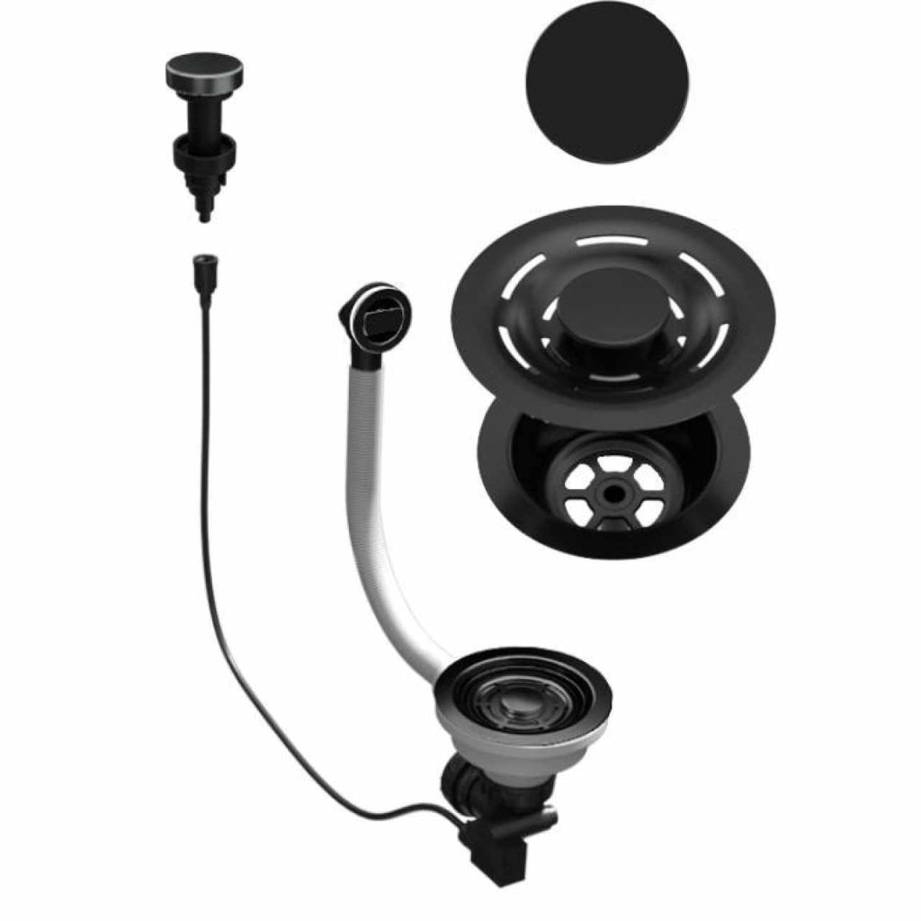 FLOW OPEN UP (nyomógombos) automata dugókiemelő, kerek túlfolyóval, egymedencés mosogatókhoz fekete színben.