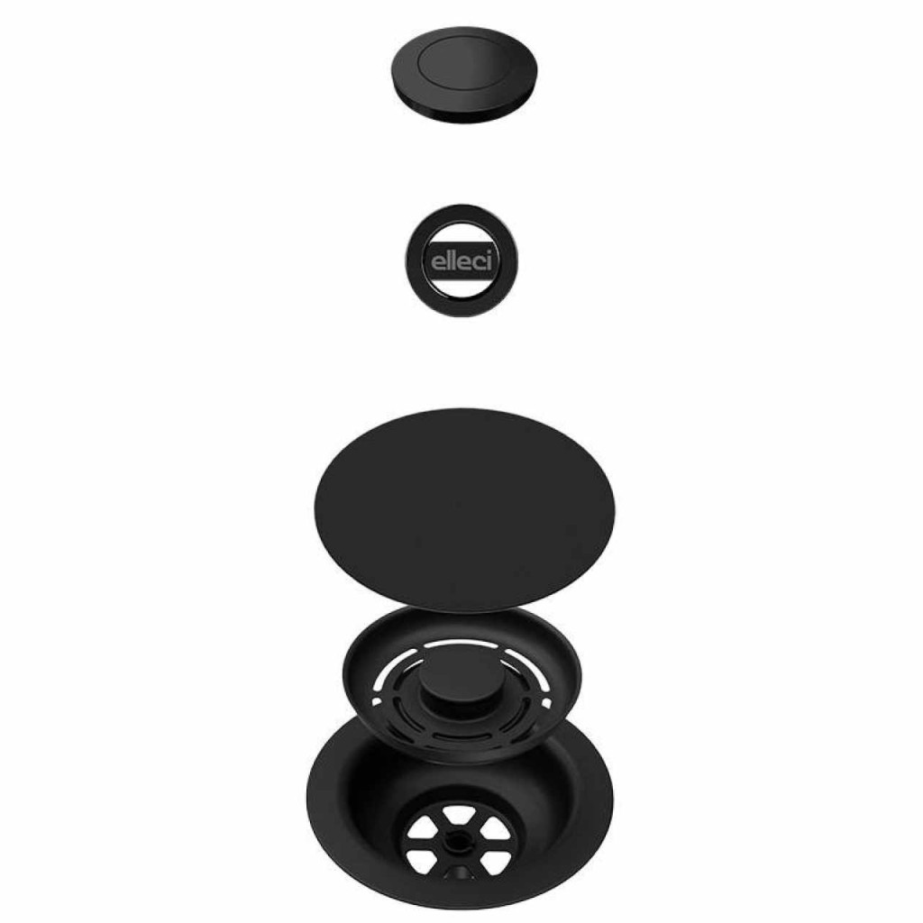 ELLECI GHOST FLOW OPEN UP (nyomógombos) automata dugókiemelő egymedencés mosogatókhoz fekete színben. FLOW szűrővel, szűrőtakaróval és kerek túlfolyóval.