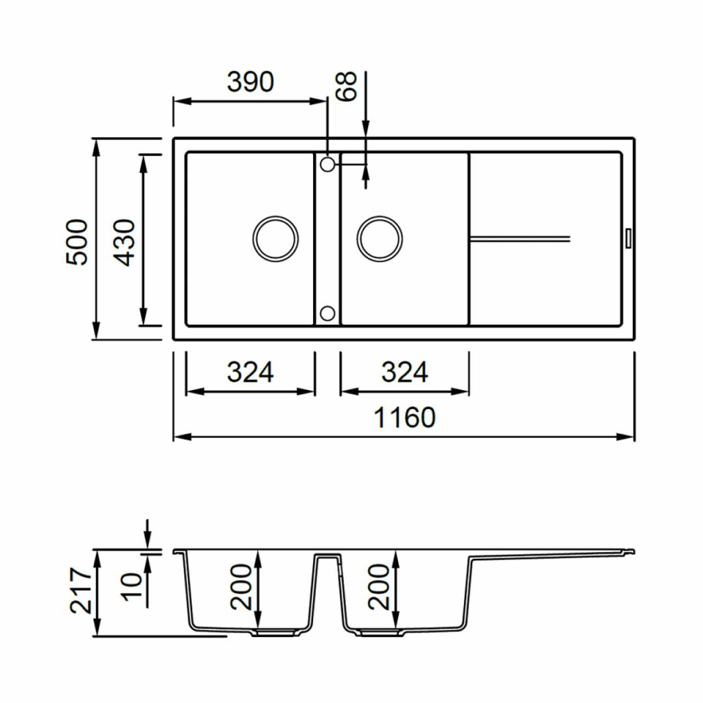 A 1160x500 mm-es teljes méret és a 200 mm-es medencemélység nagyvonalú teret biztosít a mindennapi és ünnepi konyhai feladatokhoz egyaránt. A 1140x480 mm-es kivágási méret és a 800 mm-es szekrényméret tökéletes illeszkedést garantál. A megfordítható kialakításnak köszönhetően a csepptálca elhelyezése a konyha adottságaihoz igazítható, így mindig optimális munkafolyamatot biztosít.