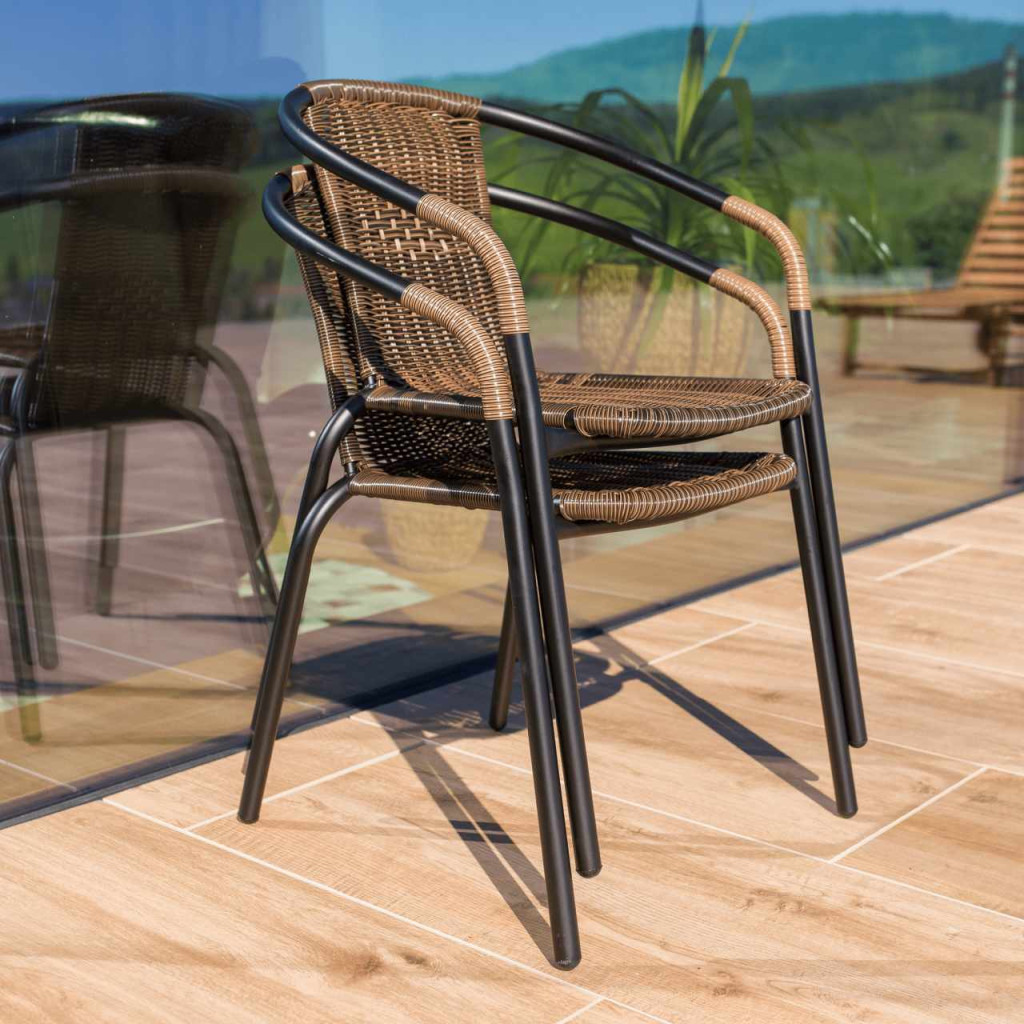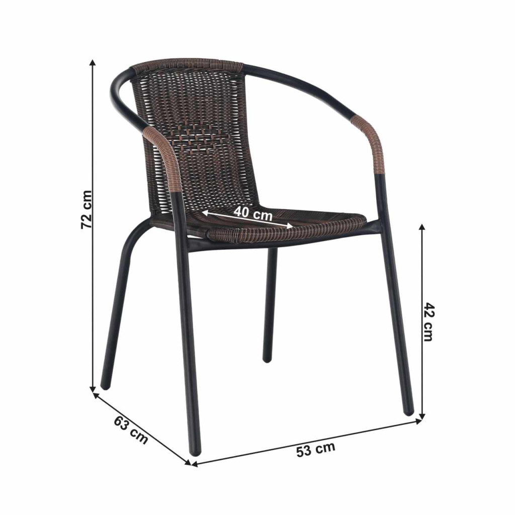 Egymásba rakható szék, DOREN Színe: barna/fekete Anyag: rattan/fém Méretek (SzéxMéxMa):53x63x72 cm Ülőrész magassága: 42 cm Ülőrész mélysége: 40 cm Terhelhetőség: 150 kg
