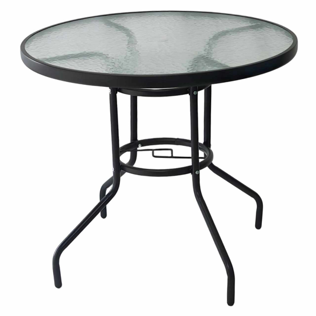 Étkezőasztal kertibútorhoz, BORGEN NEW TYP 2 Anyag: edzett üveg/acélSzínváltozat: feketeMéretek (SzéxMéxMa): 80x80x71 cmLyukkal napernyő számáraKerekTeherbírás: 50 kgSzétszerelve szállítva
