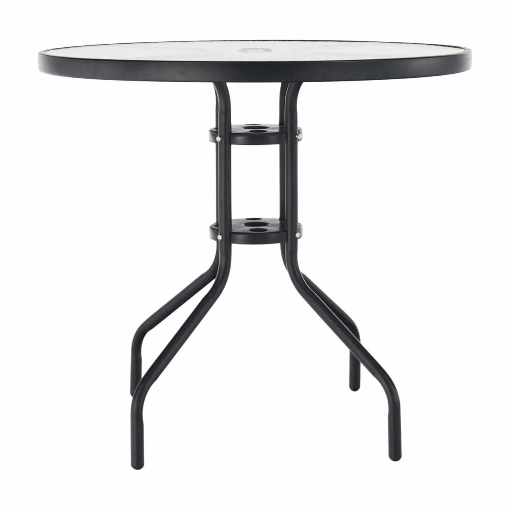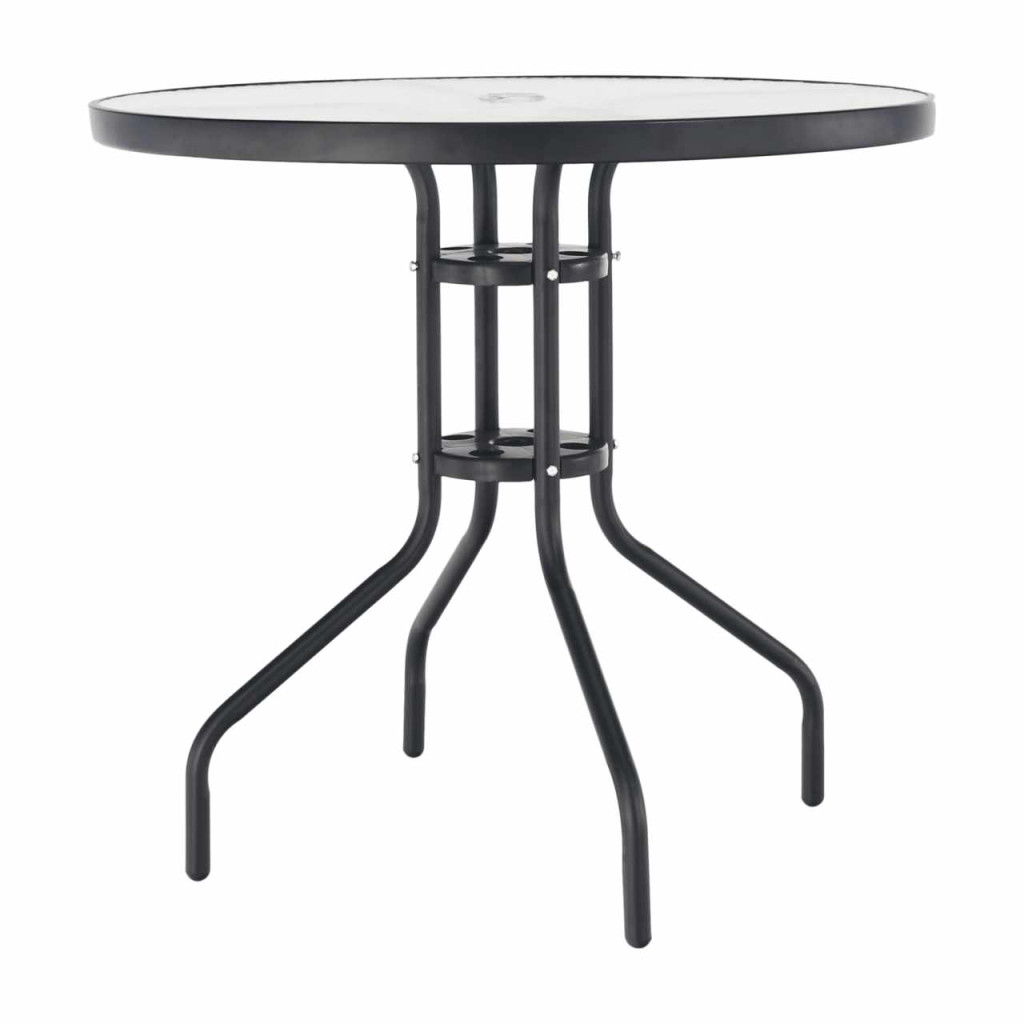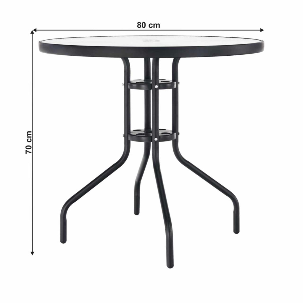 Étkezőasztal kertibútorhoz, BORGEN 2 Anyag: edzett üveg/acél Színe: fekete Méretek (SzéxMéxMa): 80x80x70 cm Lyukkal napernyő számára Kombinálható a LESTRA, DOREN, VARDA, BERGOLA székekkel.