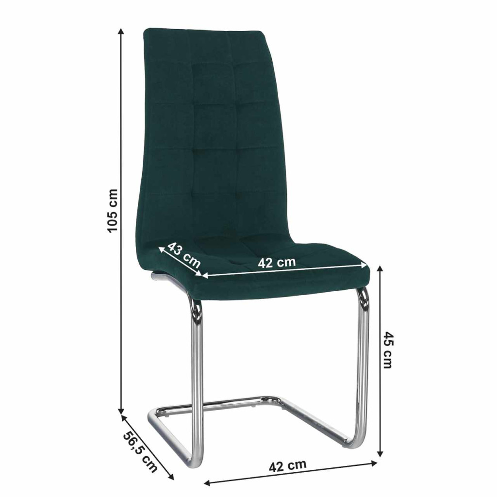 Étkezőszék Anyag: velvet szövet, színkivitel: smaragd/króm Méretek (SzéxMéxMa): 42x56,5x105 cm Szövet kopásállósága a Martindale-teszt szerint: 85 000 ciklus Ülés mélysége: 43 cm Ülés magassága: 45 cm Ülés szélessége: 42 cm Teherbírás: 110 kg