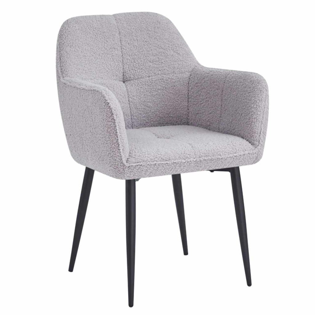 Anyag: Bouclé szövet/fémA szövet kopásállósága a Martindale teszt szerint: 45 000 kopásSzín: szürke/feketeMéretek (SzxMéxMa): 57x61x84 cmÜlés magassága: 44 cmÜlés mélysége: 45 cmÜlés szélessége: 44 cmHáttámla szélessége: 44 cmHáttámla magassága: 40 cmKartámaszokDekoratívan steppeltDizájnosTeherbírás: 90 kgSzétszerelve szállítva
