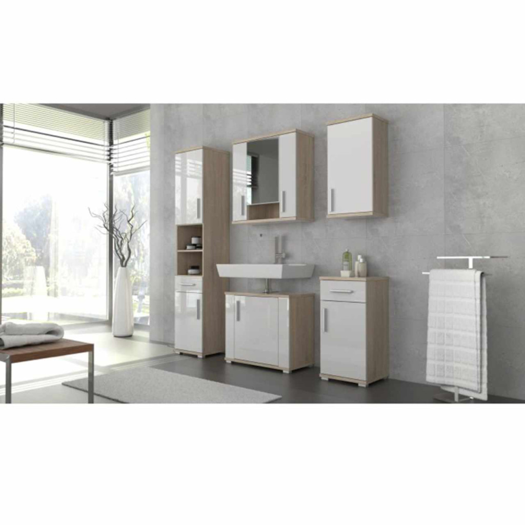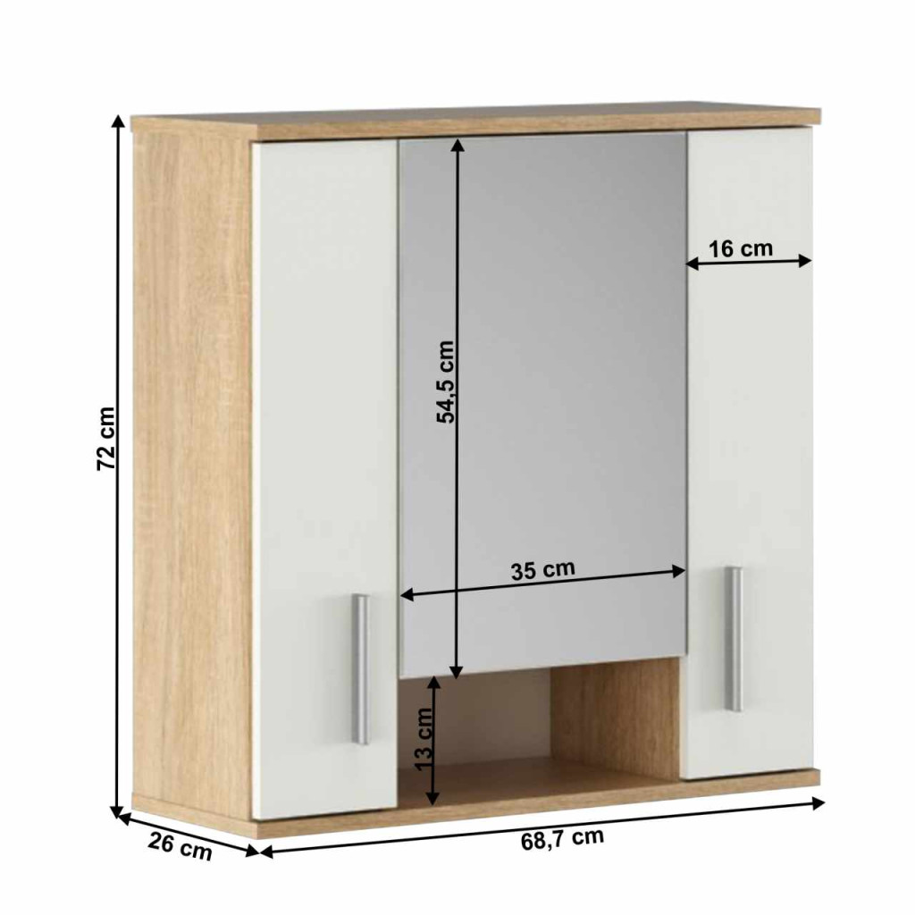 Anyag: laminált DTD/üveg Szín: sonoma tölgy/matt fehér Méretek (SzxMéxMa): 68,7x26x72 cm Anyag vastagsága: 1,6 cm Műanyag fogantyúk Fogantyúk színe: szürke Kétajtós Tükörrel Tükör méretei (SzxMa): 35x54,5 cm Nyitott polc Modern dizájn Szétszerelve szállítva