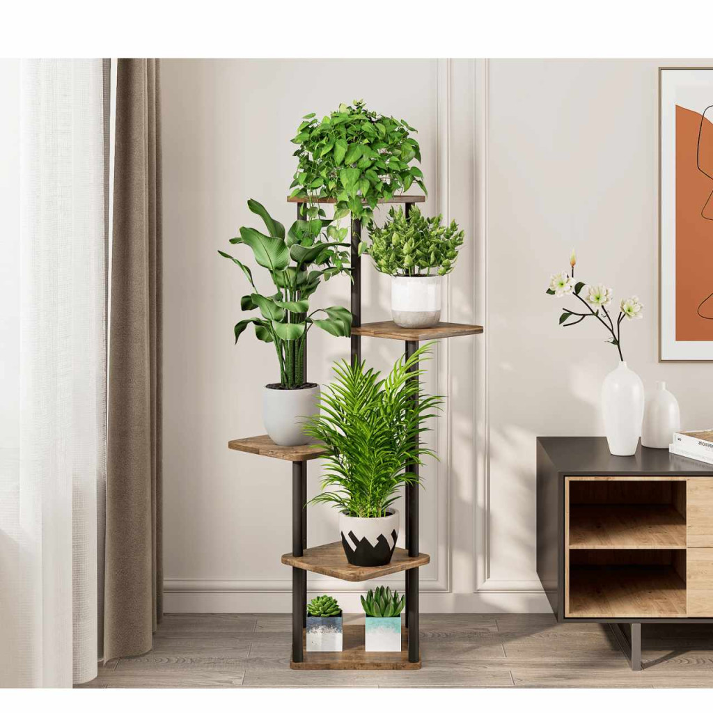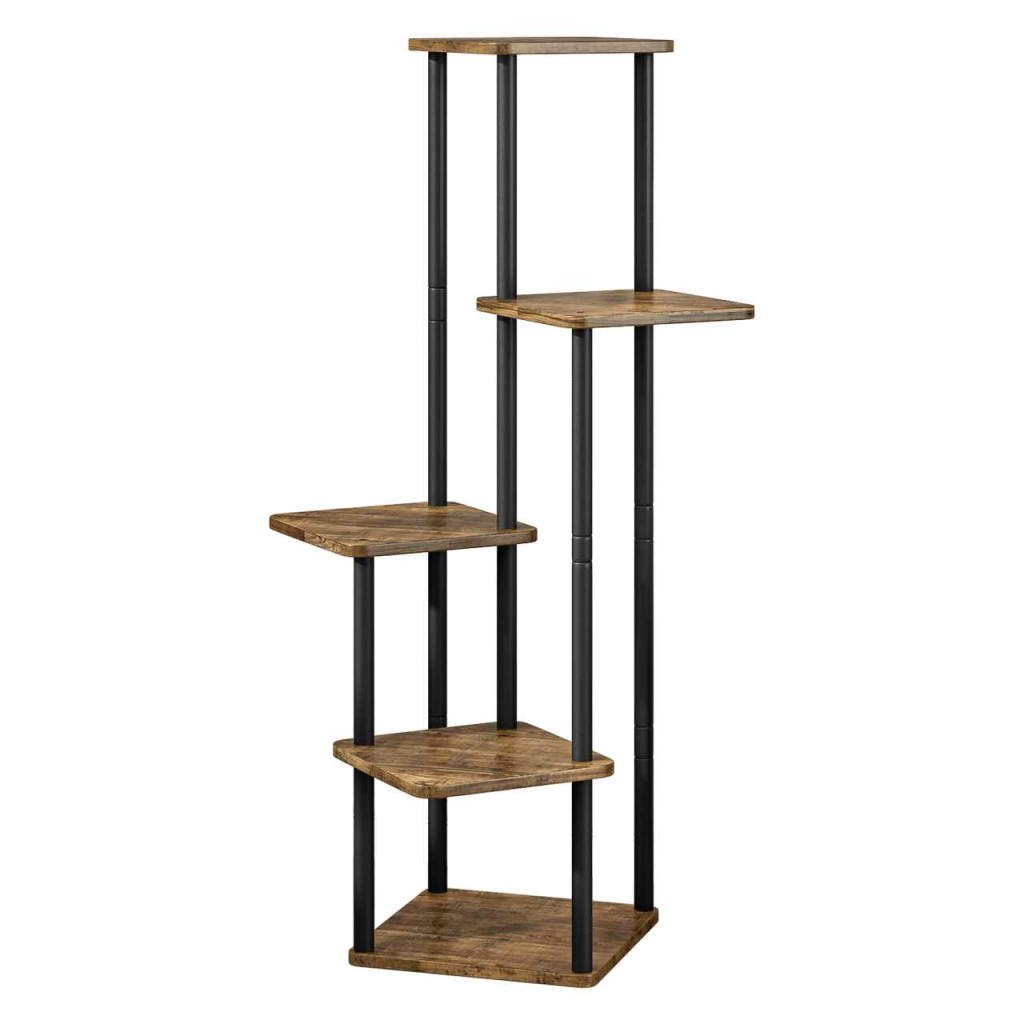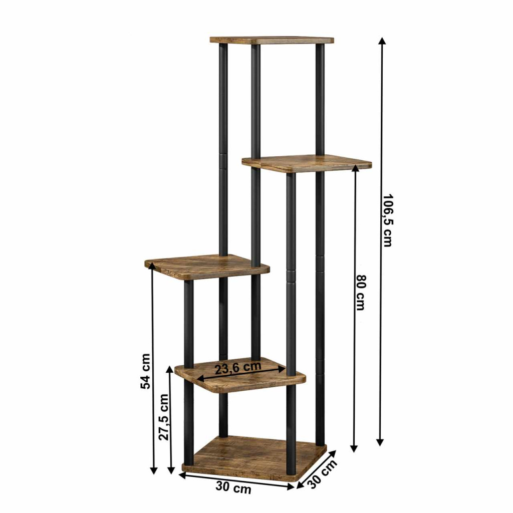 Anyag: fém/faforgácslap Szín: fekete/rusztikus fa Méretek (SzxMéxMa): 30x30x106,5 cm Állványként cserepes növényekhez 5 polc Teherbírás/polc: 3 kg Fém szerkezet Rúd vastagsága: 1,6 cm Magasság az 1. és a 2. polc között: 27,4 cm Magasság az 1. és a 3. polc között: 54 cm Magasság az 1. és a 4. polc között: 80 cm Modern stílus Szétszerelve szállítva