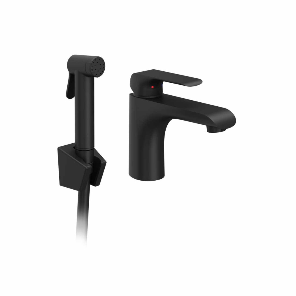 Flat álló mosdócsapteleo bidézuhannyal, leeresztő nélkül. Matt fekete kivitelben.